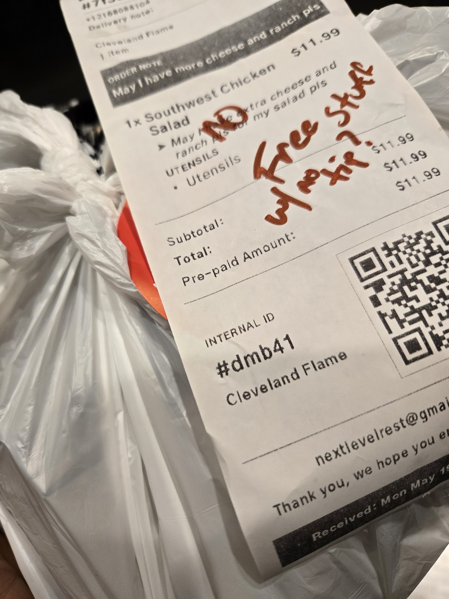 Update...hey Mike, would you trust your food after this inconvenience. I had 30 minutes for break on a double shift...whoever is behind those walls in the food hub never comes out nor when I did call from work did they pick up. I had no problem paying for the free ranch...watch who you hire next time. My employees have respect for the public. The salad probably was good but lacked a lot of the ingredients it was to provide. The little sauce was not enough to even cover it... good luck with your business. I won't be back nor trust my food being made from upset employees that don't get a tip on something they have to...