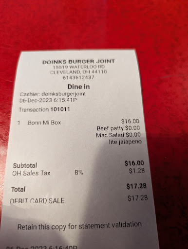 Read moreWas invited to Doinks by a friend a couple of days ago. Been wanting to try it anyway, so I didn’t hesitate saying yes. Pretty cool spot on Waterloo. Street parking right in front, or there’s a community lot behind the building. I glanced the menu and quickly fixated on the Bonn Mi. Had to try it. Option of fries or upgrade to onion rings. I typically upgrade to onion rings, unless the fries are hand cut - and that they are here! Nice! Fries jt is. The burger was good… very tasty and flavorful. The jalapeños and kimchi worked well to emulate the “bahn mi” spirit. What I didn’t know is that they are smash burgers. I suppose I should have known when they didn’t ask me how I like my burger done. I always get medium. I’m not opposed to smash burgers, but I prefer a thick and juicy patty… and for $16, I thought it’s a bit pricey for a smash burger. Price aside, no complaints!