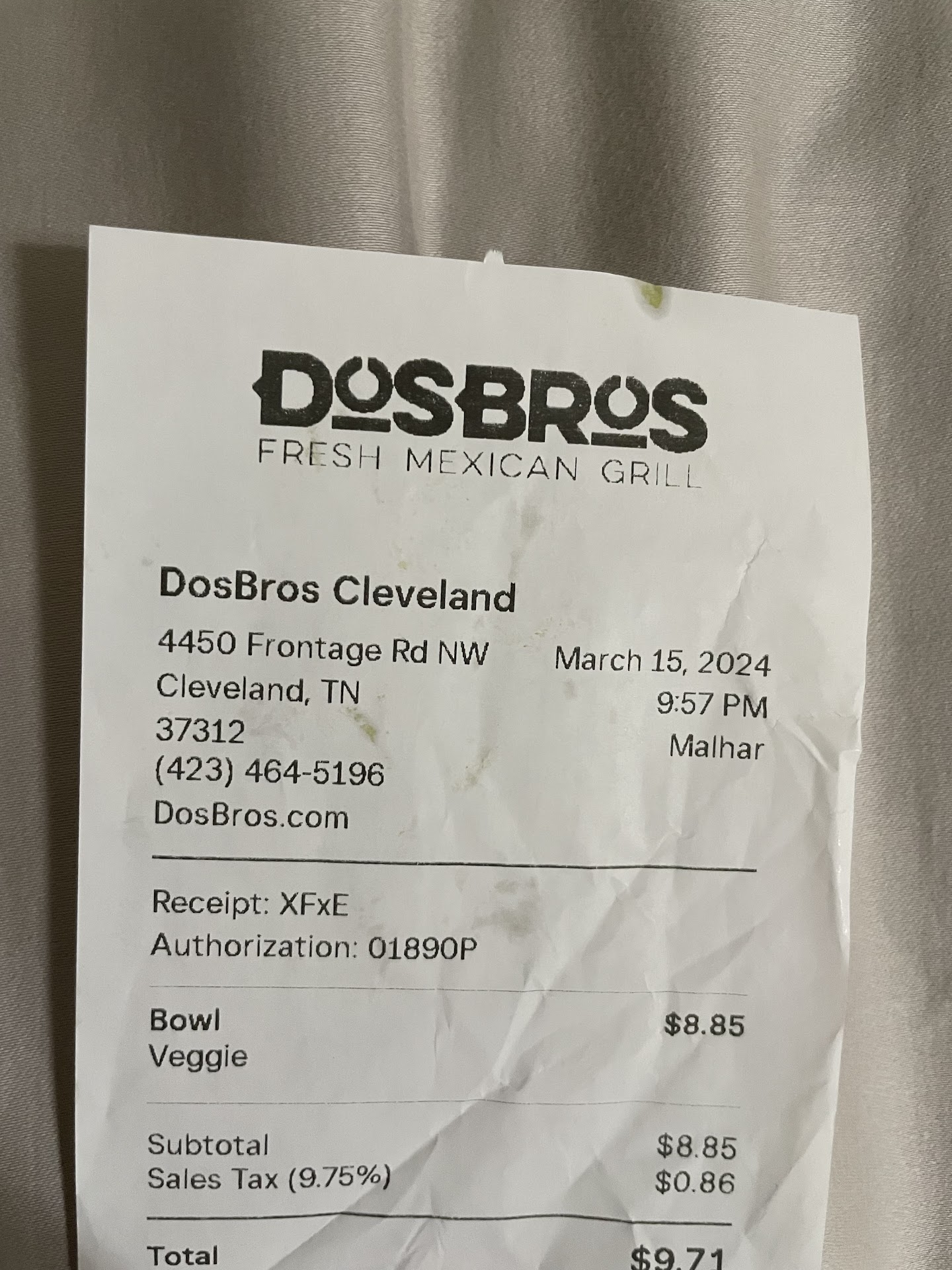 Read moreIn the heart of Cleveland, TN, there's a culinary gem that goes by the name of Dos Bros. It's a place where the zest of life is served in a bowl, and the freshness of each dish is as clear as the bright skies of Tennessee. The menu is a parade of choices, each more tantalizing than the last, yet priced not to break the bank but to mend the spirit. It's a rare find in today's world — a place where affordability doesn't compromise quality. And let's talk about the portions! At Dos Bros, they serve you not just with food, but with generosity. The bowls arrive, heaping with goodness, ensuring that you get more than your money's worth. It's a feast for the eyes as much as it is for the stomach. I recommend, no, I urge you to visit Dos Bros at least once. But be warned, for this is not a place one simply visits. It's a place one is drawn back to, time and again, by the allure of its flavors and the warmth of its welcome. So go ahead, take the leap, and dive into the vibrant flavors of Dos Bros. Your palate will thank you, and your wallet will nod...