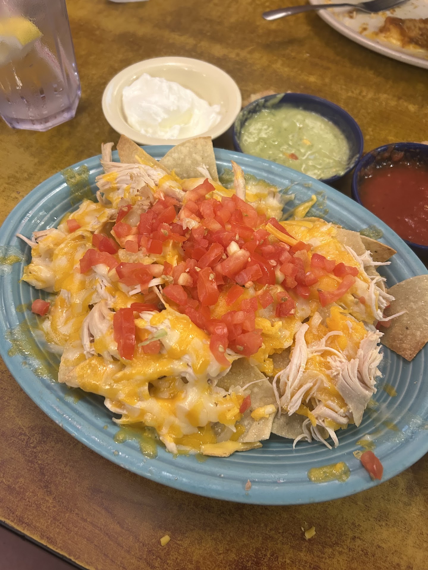 I am also one of those people who does not like to have their cool sour cream & guacamole suck on the hot food until I am ready to use it. The sour cream tends to melt in & loose all it's creaminess. So I wished that they had not piled it on the nachos. I quickly scooped it off. The guacamole needed more lime & salt to suit our tasted. My son who didn't see me doctor it up was raving that they should be famous for theirs. If you are wondering I mixed what came with both meals together added 4 slices of lime, some of the chopped tomatoes from our nachos & some salt.