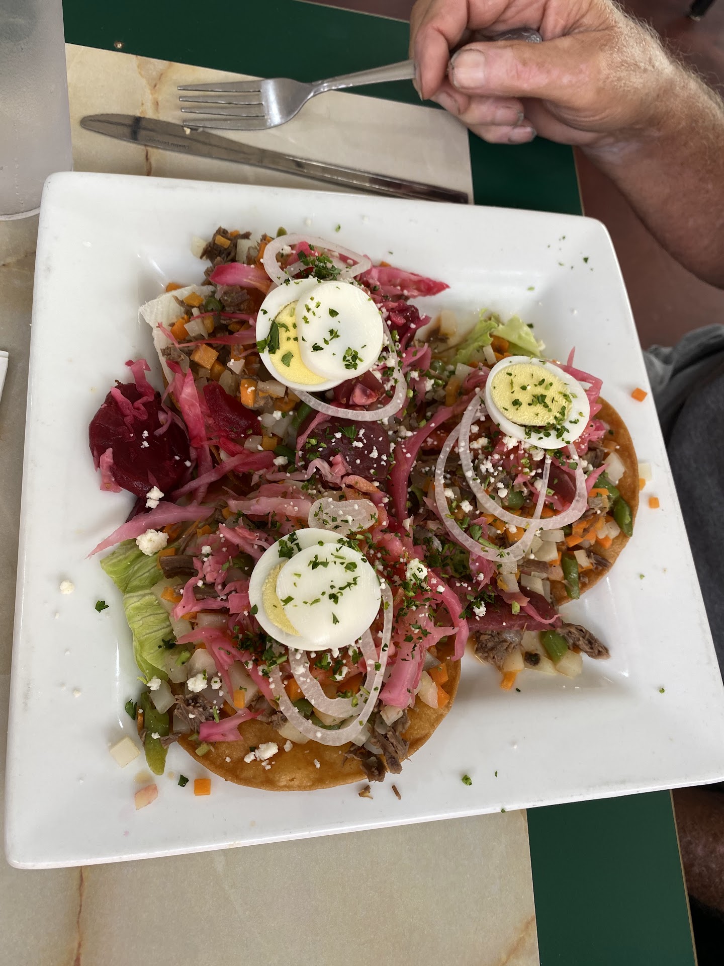Started with the sampler to start. Nothing was bad, but nothing stood out IMO either. It was a little small for the price, but you got to try a variety of things which was nice. My dad ordered the enchiladas- not at all what we expected being more familiar with Mexican style rolled tortillas. These were fried open faced tortillas topping with carnitas and a really good Guatemalan slaw. It didn’t have as much meat as we would have liked, but the slaw was generous and delicious- it had pickled cabbage, beets, carrots, and onions. Wasn’t expecting beets, but added a nice touch. I got the seared flank steak. It was nicely cooked and the guac and green onions were nice. The rice and beans were bland, but ordered some extra salsa and made them pretty good. Also added on a chorizo taco, and was a solid taco with a really good salsa verde on double tortillas- street style of course. My girlfriend ordered the ejotes dish (don’t remember the full name)- it was battered and fried green beans that she really enjoyed and said they were traditional (having spent months in Guatemala). She said the same thing about the rice and beans as I did, but did the same with some salsa.