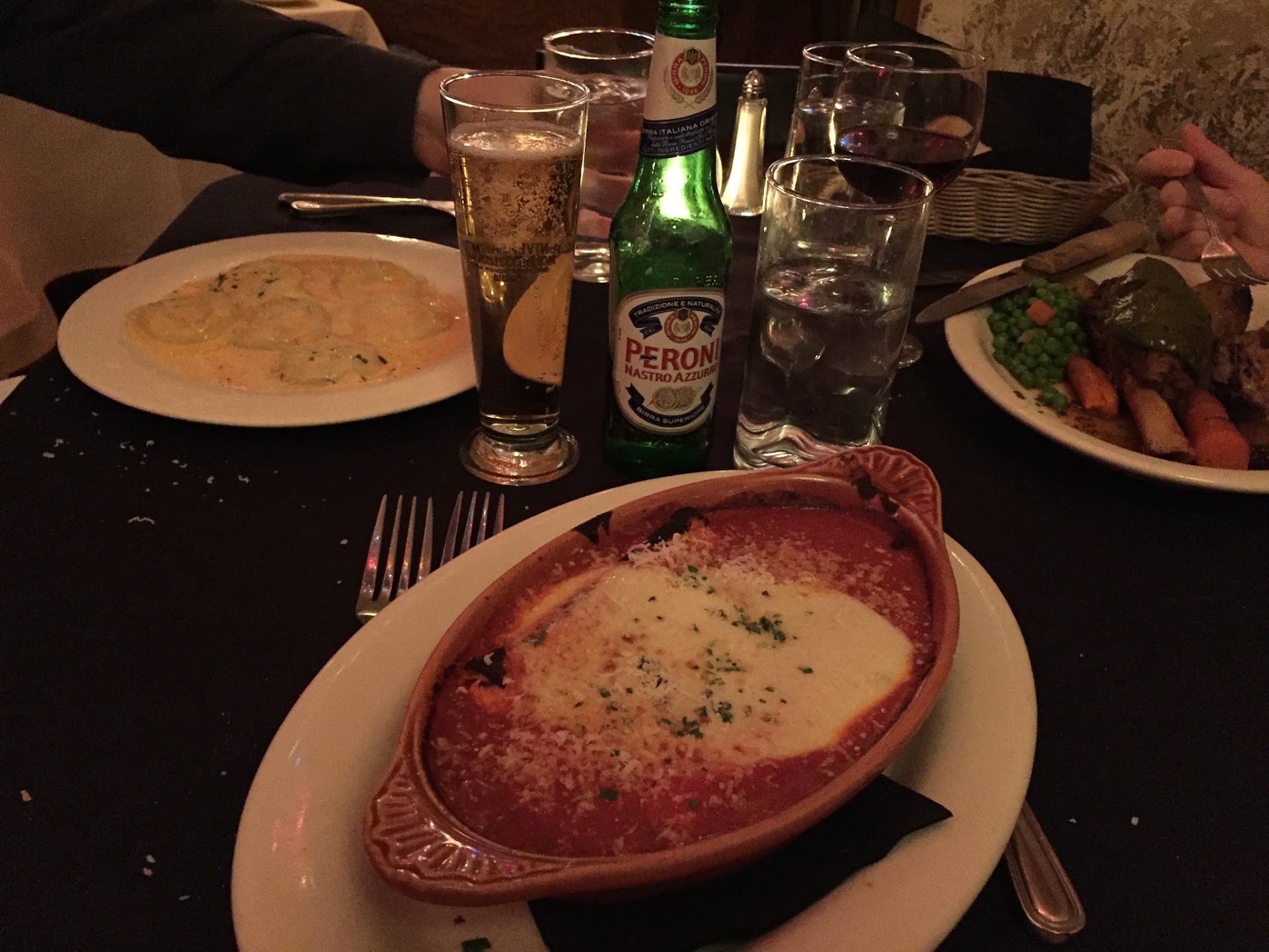 OK, the food, very good. The caprese and casa salads are both excellent choices. There was a special on black pasta with shrimp, it looked wonderful, and my friend enjoyed it. I had the Scaloppina al funghi, and it was also very good. Tartufo al cioccalato was desert, end of a very enjoyable meal.