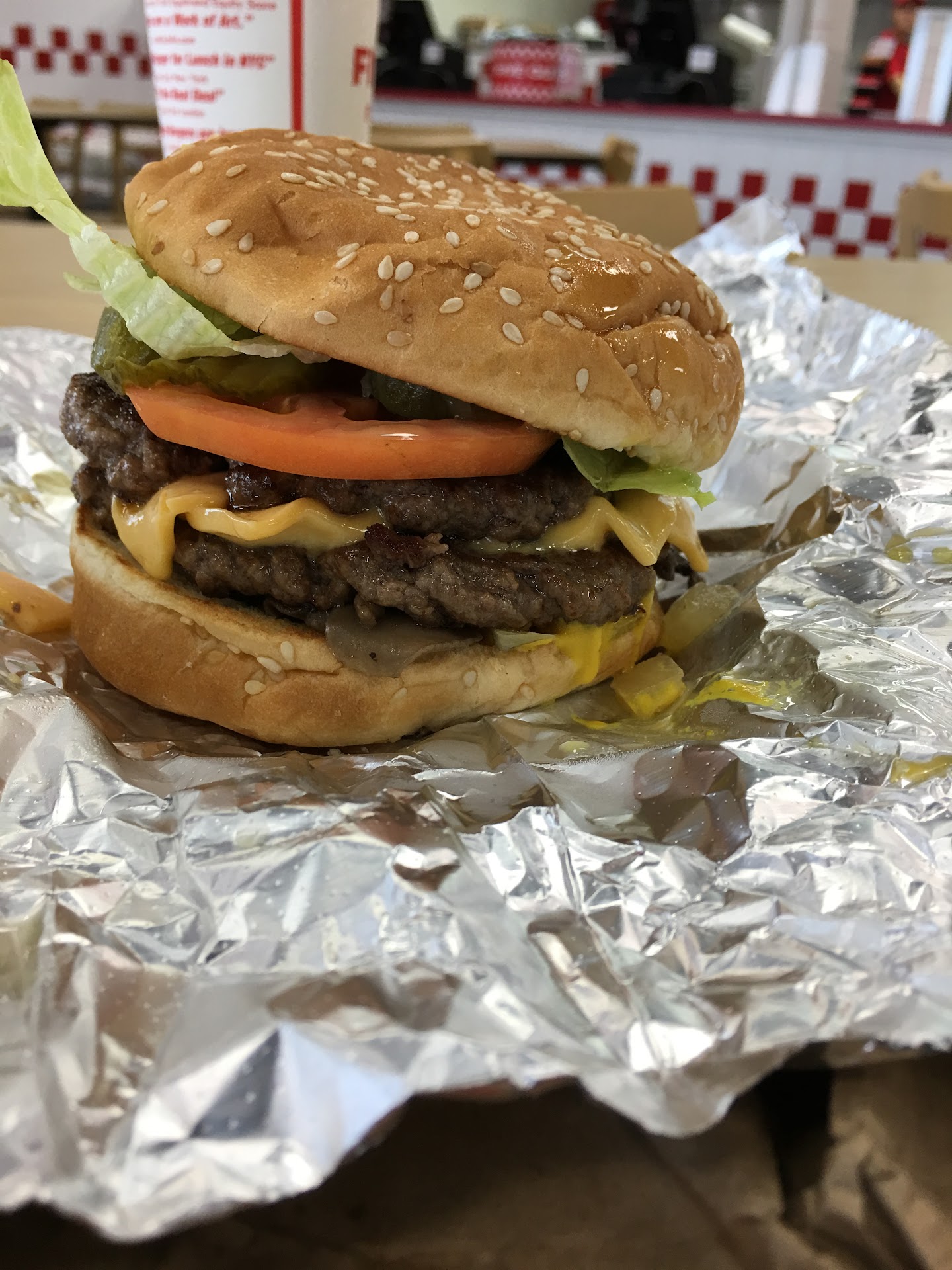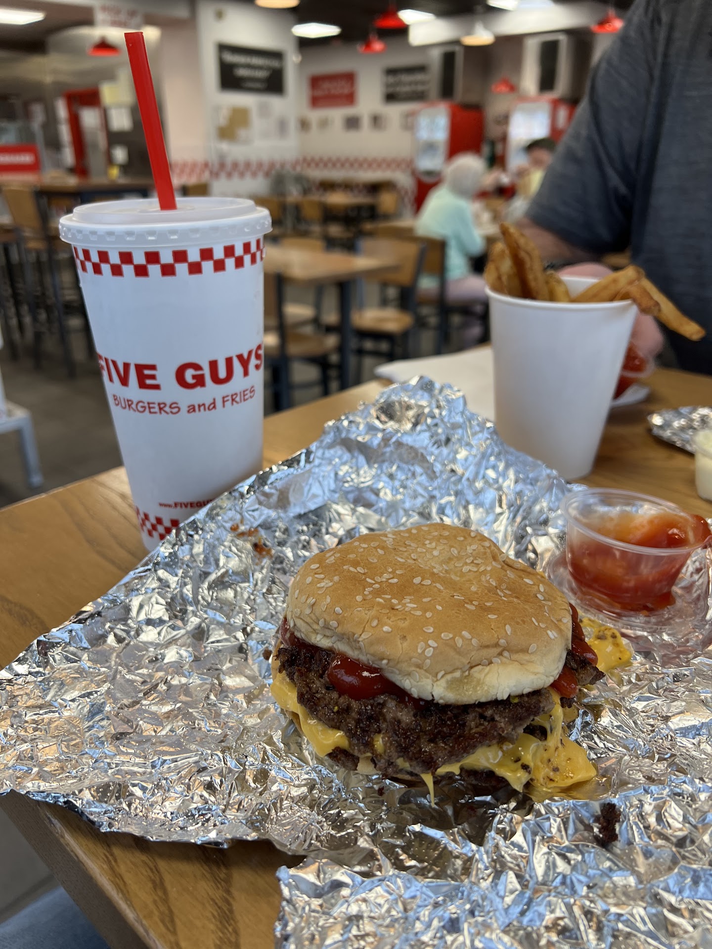 Read moreThis was my first time eating at Five Guys so I wanted to check it out. I have had their fries before but never a burger so this time I just wanted to order the cheeseburger. The Cheeseburger was expensive but you get what you pay for! This was the best fast food cheeseburger I have ever had! Donât come here expecting to eat under $6 this isnât McDonalds. The cheeseburger was about $8 but once that bad boy came out you know where your money went. Everything is made to order and it was delish! Also this cheeseburger was double patty and double cheese so it was huge to say the least. When I come back honestly I will probably just get the junior burger which is only one patty I would assume and those are only like $6. They are famous for their fries and they are excellent. Fries start at $3 so expect to pay over $10 a person for a full meal! Presentation was on point as well I even took a photo to post but canât find out how to post it but oh well! 5...