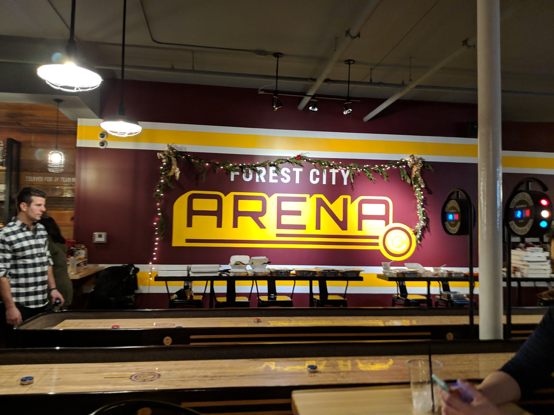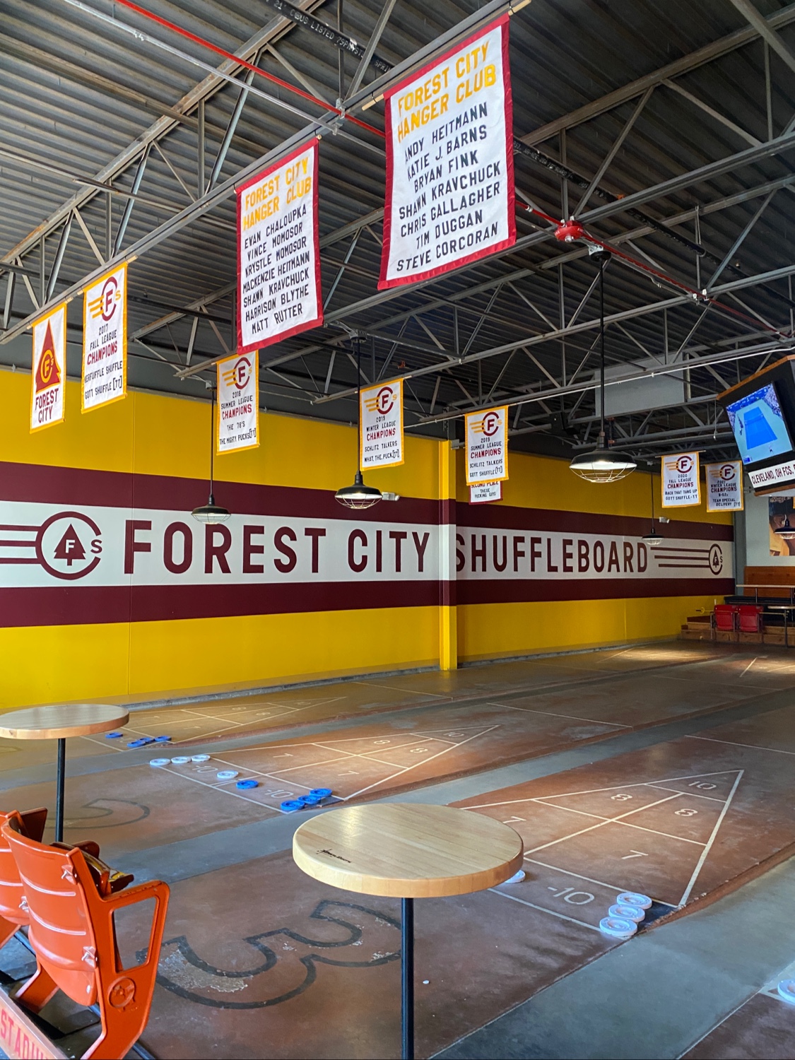 Other than the lack of availability, this place is pretty cool. They have a bar area with a few table top shuffleboards. These are easier to get reservations on, but we weren't really interested since plenty of bars have them. Then in the back they have 5 or 6 shuffleboard courts. I now realize why it's so hard to get in — they would be better off with way more courts.