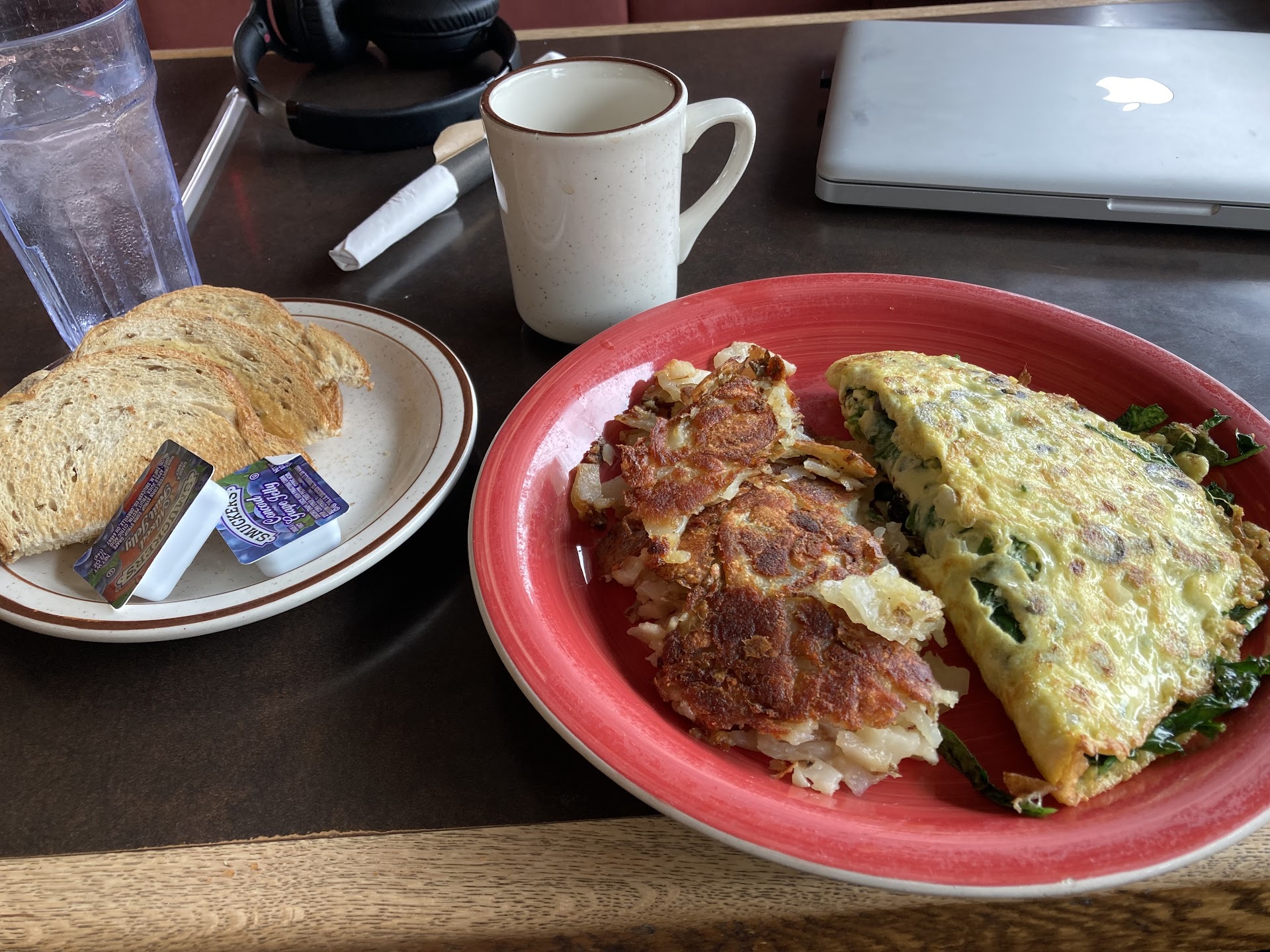 I ordered the Mediterranean Omelette off the breakfast specials menu. This thing is loaded with spinach, olives, and especially feta cheese, which is bursting out when i cut into it. Delightful.