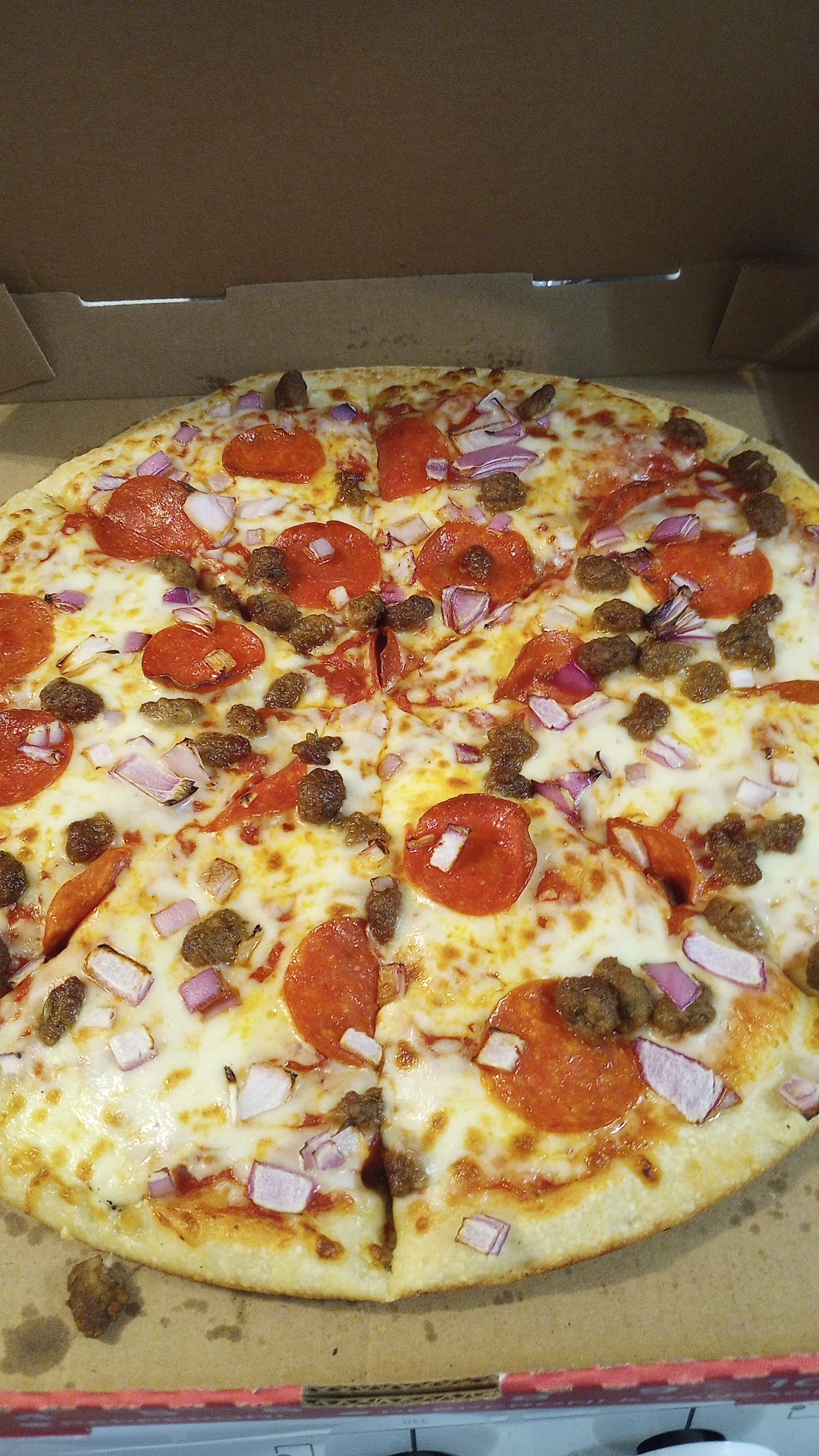 Read moreI went to this pizza place on my way home they took my order and said 6minutes I thought that was odd I ordered mozzarella sticks a large pizza and breadsticks got the order I paid 14.oo for this I get home which is about 5min from there only to find old pizza cold and the bread sticks were full of old grease and the cheese sticks were chewy so I went back there only to find them closed they gave me the old craps so they can make a profit and didn't have any leftovers I went back the next morning same guy I had all the food and said this was old when you have it to me he wanted to argue saying it was fresh so I said for him to eat it for lunch and I walked away.not...