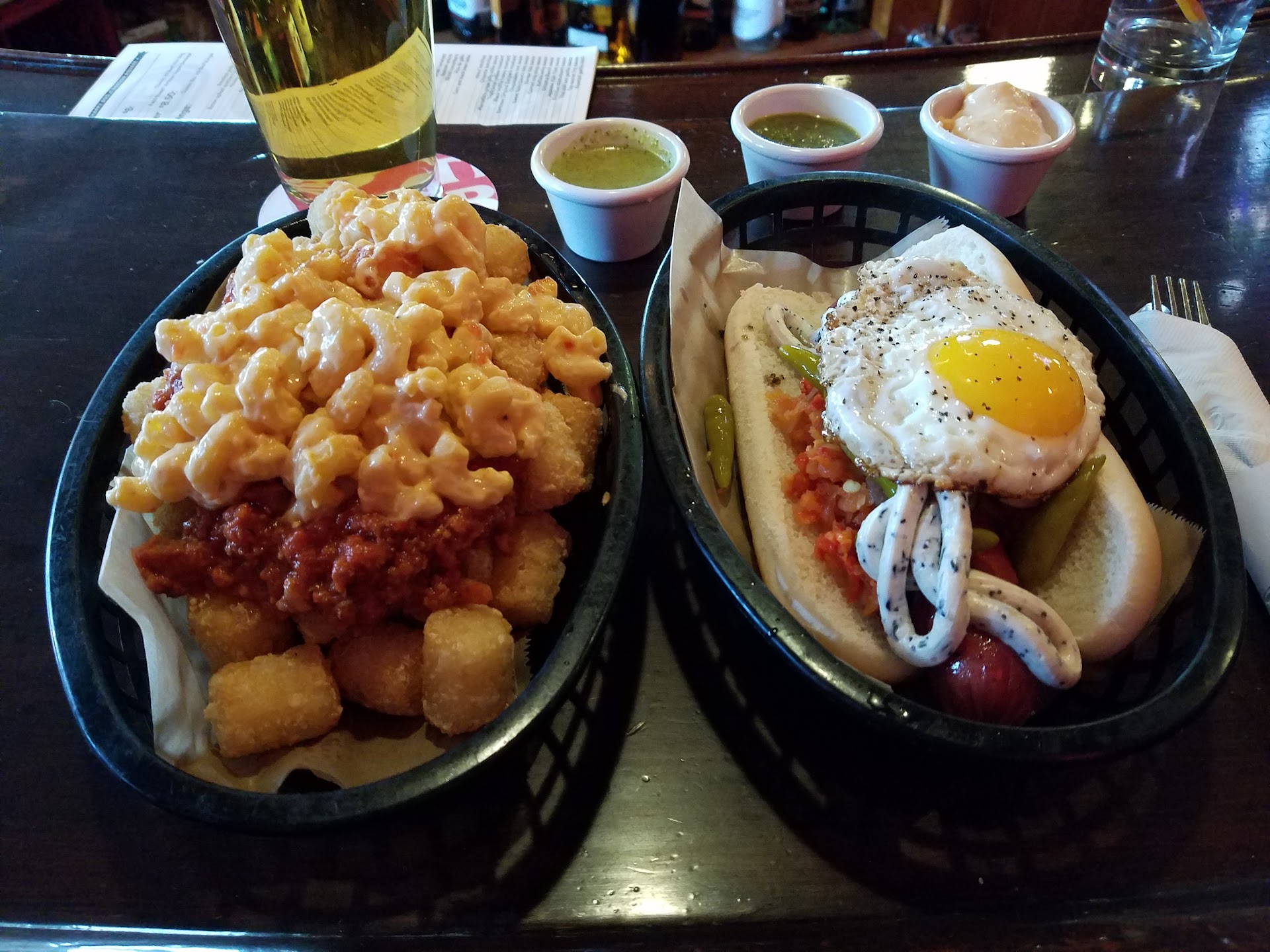 Lately I've been on a breakfast kick. My latest creation consisted of a Fried Egg, Sport Peppers, Cherry Pepper Relish, and Everything Bagel Cream Cheese. Throw in some Tots with Chorizo Chili and Pimento Mac n' Cheese and you're set!