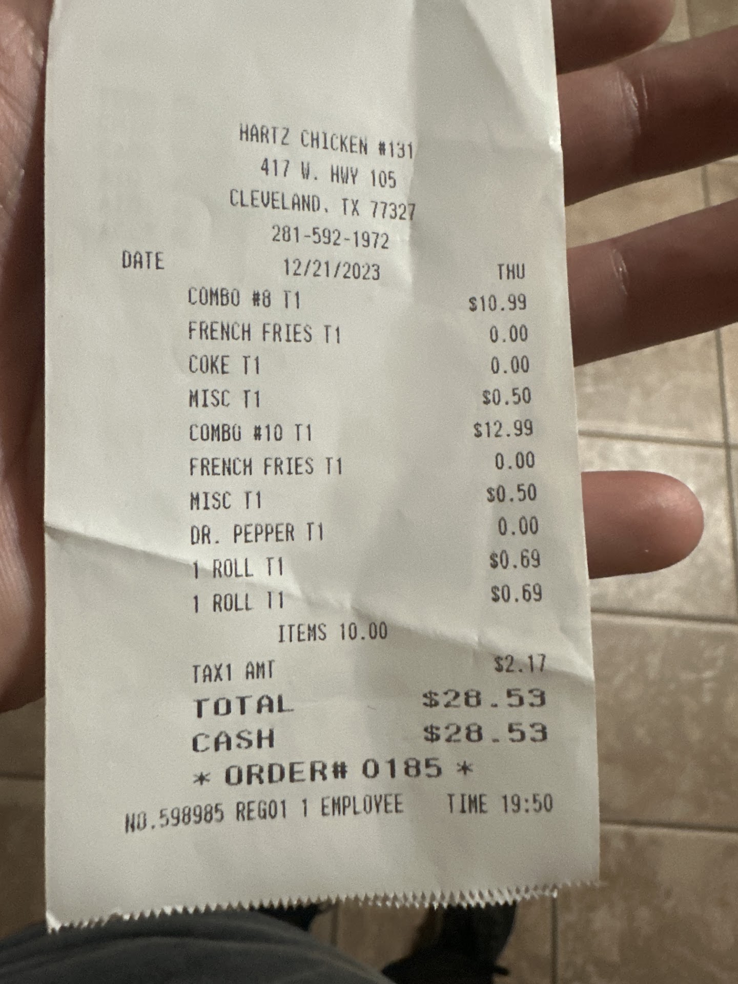 While passing though to go see the Christmas Ranch I stopped to get dinner with my family. I ordered a number 8 (3 piece white) and a number 10 (7 tender combo) and it wasn’t until I reached the ranch about 30 minutes later and I had a chance to look at my food did I notice I was given a number 7 and number 8 so I just decided to go back by on my way back home and get it redone seeing as I don’t eat bone chicken the first employee I had interaction with was amazing. He immediately took back the wrong food and started making my correct order when he informed the manager (who was the main Packer and had a headset on to also hear orders) the manager came to me and told me I made a mistake while ordering and that I ordered the wrong thing and he heard me order it not long ago and told the employee he needed me needed to charge me for the extra five dollars. I told him I had my receipt in the car and I was more than willing to go get it to show him. I did order the seven tenders. I did order the correct thing I was just given the wrong thing he proceeded to try to tell me what I ordered and tell me what my price difference would be and I told him to ring it up so I could see what the price was for what I ordered and what he thought I ordered. I personally have worked in fast food enough to understand the customer isn’t always right and mistakes happen while ordering but I also understand there’s no need to argue with a customer when they’re telling you what they ordered and what they got is not the same especially one who’s coming in with no attitude or...
