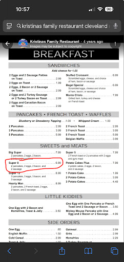 I paid the price with no problem but I definitely will not be coming back. Prices are not right so u pay basically whatever they say. I would take my business elsewhere. Most places diners in Cleveland for a two pancake breakfast you’ll end up paying about $12.99 for two. I paid doubled...