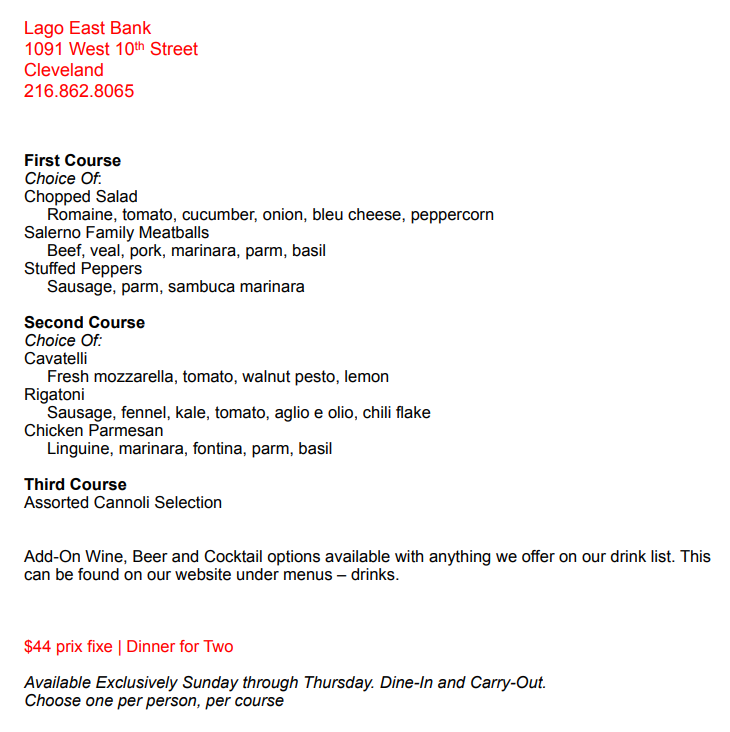 The restaurant failed to honor an advertised price that was - and currently is - posted on Cleveland Restaurant Week's website (see attached image). The advertised $44 dinner for two was - upon arrival to the restaurant and after spending $10 for "special event parking" - $44 per person. Big difference! It was deceptive and false advertising that the manager said was a "mistake" and that what they submitted online was wrong. This is despite the fact that 1) no other restaurant had similar language in their pricing/description (e.g. typo probability is low), 2) the website has been up for days at this point in time, and 3) Restaurant Week has been active for nearly two days now. Also, quick side note, the part that ended up making this $44 dinner "special" was the inclusion of a free cannoli. Existing pricing of their first and second select courses added up around that $44 dollar mark anyway.