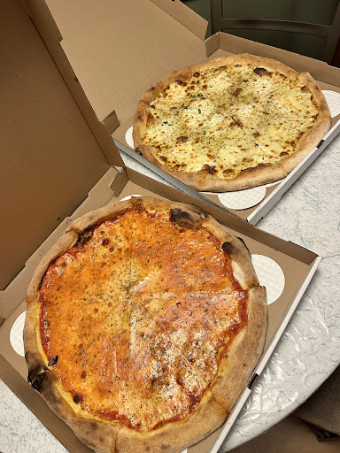 Ok, texting can be hard. Feelings can be misinterpreted, leading to misunderstanding. So I went in the front door and asked for half white/half red. I had looked in the window to start with, there were 2 white pies and 2 red pies in the window, with multiple pies in the oven. The lady at the register, who I had dealt with all night, told me I would have to "but by the slice".