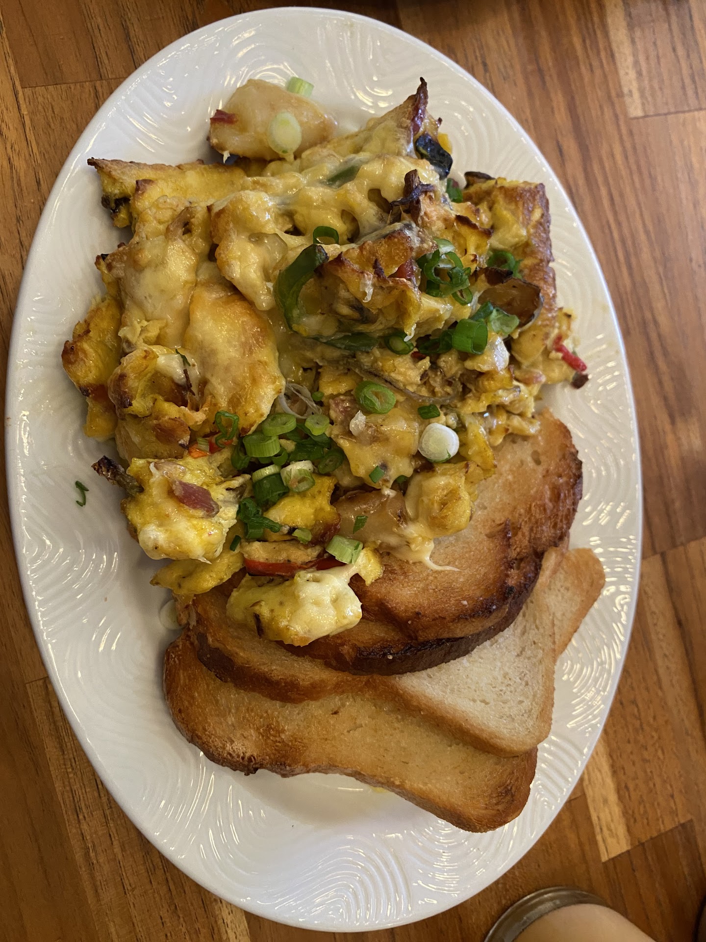 We had brunch at Lucky's Cafe on Sunday April 14, 2024. I have so many things to say about this place, so let's just start at the beginning. We found street parking right out front. There is not a designated parking lot. For a party of two, we were quoted a 40 minute wait. After only about 15 minutes, we got a call that our table was ready. We were seated at a table right next to the kitchen door which was a bit chaotic, but worked fine for our party. Our waitress was very attentive and quickly got our drink orders. I ordered a Thai iced tea and Kevin got an iced Lucky's latte. Both very good but nothing special. For our meals we ordered the biscuits and the shipwreck. Seasonal vegetables in the shipwreck included bell peppers, onions, and mushrooms. Very generous portions and delicious. The fresh fruit side with the shipwreck consisted of half a strawberry, slice of pineapple, and wedge of orange. Seems like not much, but was the perfect amount of a refreshing sweet bite after the large plate of everything else. On the table was a house made sweet and smoky hot sauce that I used on every bite of the shipwreck. So delicious. Saved my last piece of toast to eat with their house made blackberry/raspberry/grape jam. Incredible. Included large pieces of fruit, which I love in a fresh jam. And I haven't even mentioned the pecan bacon*. After my first bite, I was thanking our waitress for bringing it up and telling us about it. Definitely would normally overlook getting something like that as a side dish. There are also several vegetarian options on the menu, with one dish able to be made vegan by getting the toast with no butter. We interacted with several staff members at different phases of our meal. Everyone from the hostess, to the barista, our waitress, and the other servers helping to run food/clear plates was abundantly friendly and helpful. One waiter passing by noticed us looking at the art above our table, which was an original painting from a local artist, and told us some interesting facts about the piece. Felt like a true collaborative team working to make the best experience for all guests. Overall, service was incredible and food was delicious. The only reason I am knocking one star off "atmosphere" is due to the fact that this place is not accessible for people in wheelchairs/other disabilities. You have to walk up a step just to get in the front door, and the entryway is so cramped with a pasty/coffee counter plus the host stand. The aisles are very narrow and people are constantly getting in each other's way. There is also only one single-use bathroom. Everything was just fine for us, but definitely something to be aware of if you are planning a trip here! *Pecan bacon comes with 3 pieces, but I got too excited as soon as the plate came out!
