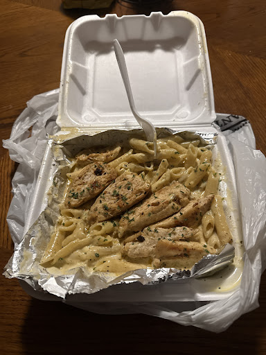 From the very first glance, this chicken Alfredo stands out as a hearty and satisfying dish. The presentation, even in a takeout container, is inviting—creamy Alfredo sauce generously coating the pasta, topped with tender slices of grilled chicken and a light sprinkle of parsley for freshness.