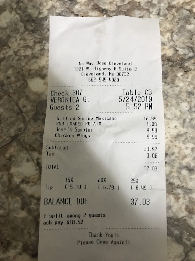 Read moreI have on many occasions turned a blind eye to racism because its Mississippi and I know how people are. It doesn’t mean it’s right but it exists. No way Jose has an extremely Racist manager. It is evident. Can’t even fake it. Smh! My friend and I ate there last night. We paid and tipped well over 20%. We were still eating and the manager kept trying to force us to leave. We weren’t causing any problems or loud. My friend asked for a Togo cup after we were constantly harassed about leaving. We have been here many times but will no longer patronize this business. When we asked why were we being rushed off after taking our plates, he exclaimed he needed the table. There were four visible, vacant tables and only two people standing around the door. Before we could even finish a glass of water this guy called the security guard over to our table. Once we talked to the security guard he even agreed that we didn’t do anything wrong and he didn’t know why the guy was rushing us out. He apologized and talked with us outside. My friend contacted Hoolio who is over the franchise at the Greenwood location and he apologized and stated he would do his best to rectify the situation. I normally don’t post these type of things but No Way Jose is really running out. First the camera posts accusing the wrong people for not paying and blasting them on social media. Not saying that that was wrong but everyone that they posted were not the people that didn’t pay their ticket. May not mean a thing to any other people, but you just missed out on these two paying customers. Customer service and respect is everything and none of that was in existence on last night. #disrespectful #racists Hoolio never returned our calls. I guess he said enough to get us off of the phone. I would not recommend this franchise to any African American person. Despite your socioeconomic status, tips and attire, they still look at you like you’re inferior. Spend your money where you are at...