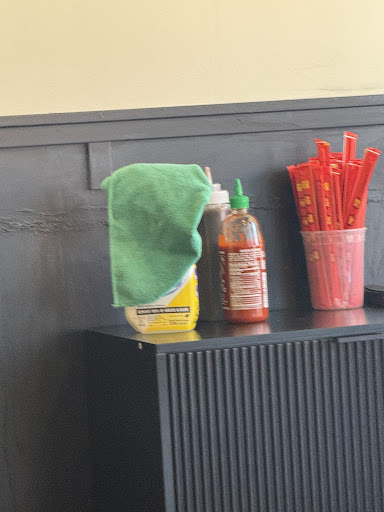 And we noticed something strange — the spray bottle for cleaning tables was kept together with the condiments???