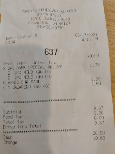 Read moreI had a 107$ order for an employee appreciation lunch I threw for a friend of mine who runs a business close to this restaurants location. Ordered the evening prior, online. Showed up 15 minutes before projected pickup window. As I pulled in I received a text informing me the order was ready. I ended up still having to wait nearly 25 mins for the order to be completed and packaged. Which honestly wasn't a big deal,, but after going inside to use the restroom while I waited I noticed how dirty and gross the dinning room and especially the kitchen was. I understand it's an underseved neighborhood, and it's hard to find decent employees these days, especially for fast food, and especially communities like that one, but there is no excuse for how disgusting the inside of that place was. Customer service was aight, but tbh after it's all said and done, I would never go to that place again. Oddly enough, it's the best rated Popeyes in the city, but that's not really saying much for Cleveland. Normally I'd steer clear of fast food, but when I do occasionally visit one I'd prefer it to have up-to-date facilities, that are not only well maintained(clean), and staffed with people who have positive perspectives and do their jobs they're being paid for to the best of there abilites. It is what it is, should've known better, but I figured give people a chance and this time I was left with egg on my...