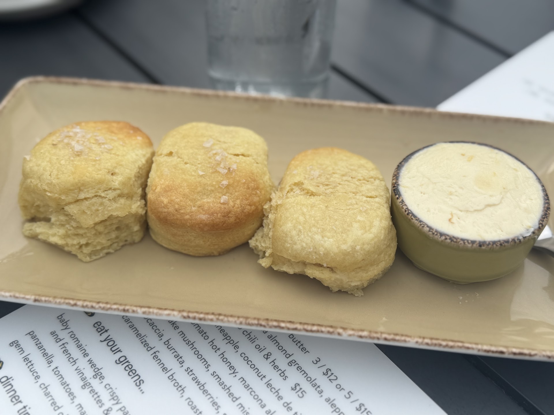 We arrived right as they opened, which gave us the perfect calm moment to take in the setting and enjoy every bite. We started with Shawnda’s Biscuits and honey lavender butter—rich, and just the right touch of sweet. Alongside that, we ordered the woodfired fresh focaccia with burrata, sunflower seeds, saba, and the most perfectly ripe strawberries. It was as gorgeous as it was delicious.