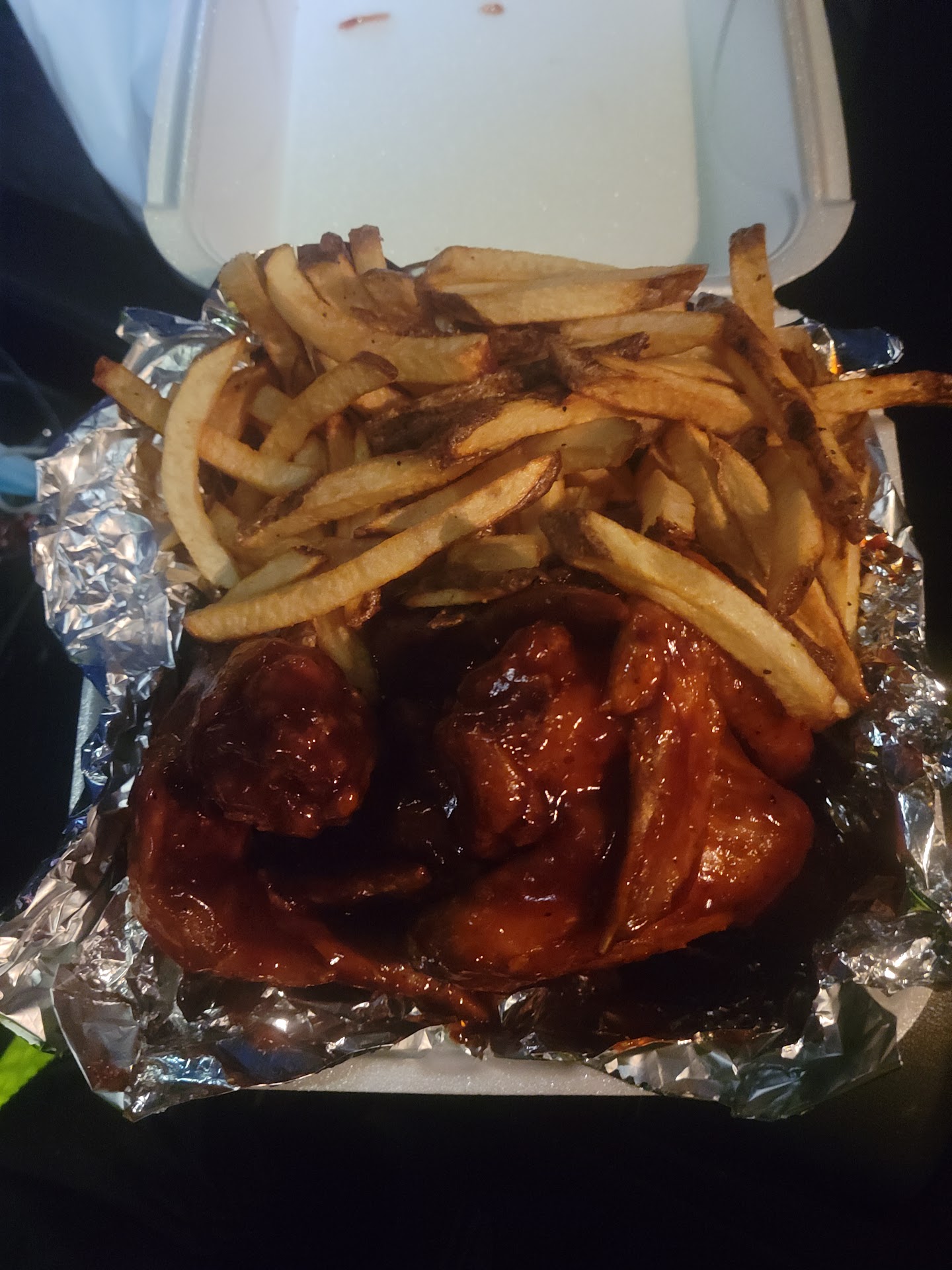 The food was delicious. The wings were fresh, cooked crisp. Sauce was outstanding. The fries were surprisingly delicious. I am not a big fry person. But when I ate theirs, I ate them all. Not bad...