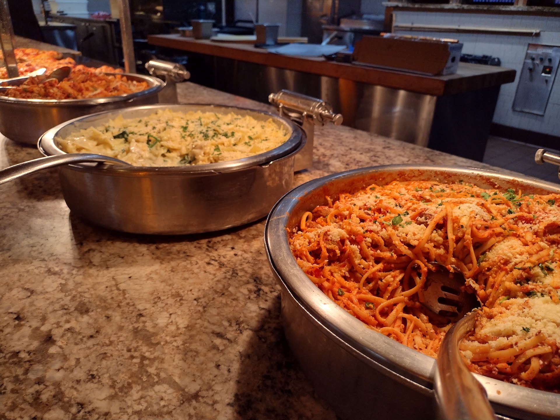 The lunch was pretty good. I tried the baked whitefish, tossed salad, stuffed shell, charbroiled burger and stir fry broccolini. Burgers freshly made in front of you. Shells had a good tomato sauce on them. They have a good variety but I was trying to go the healthy route today. They had mac n cheese, fried chicken, corn bread, Asian noodles, general Taos chicken, egg rolls, ice creams, cakes, cookies and a lot more! I have no complaints as their Wednesday lunch buffet is only $5.55 that includes a beverage! Service was streamlined and my server was very good at keeping refills up. Dining areas kept very clean too.