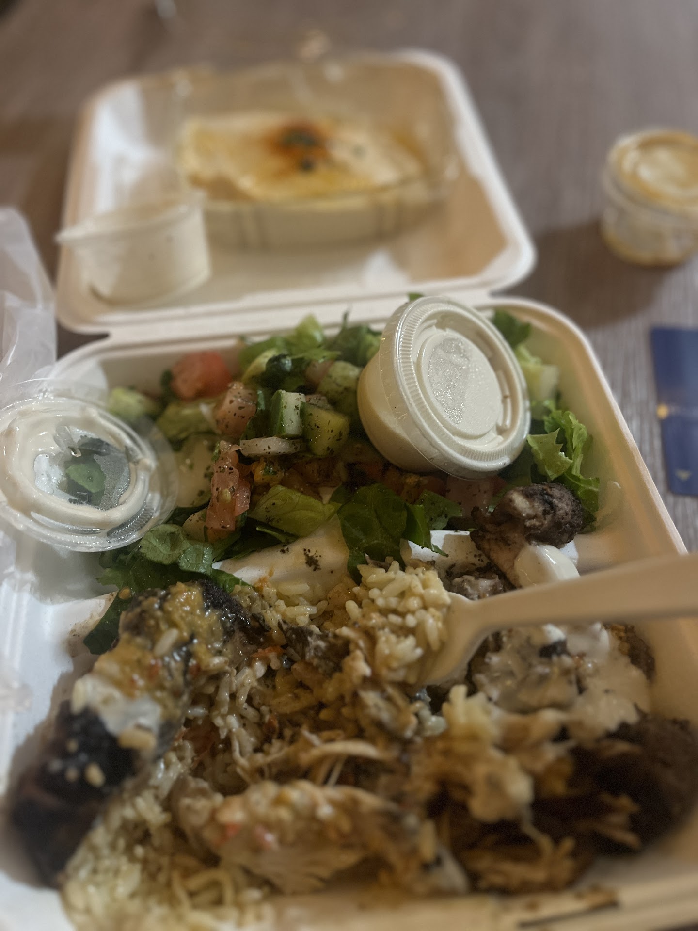 I love this Lebanese chain food is always fresh cooked to order but today i was my last time patronizing this location! When my co worker and I placed our to GO order at 11.56 am no one was there by the time we sat down two groups of businessmen that ordered after us, were eating there food in 10 minutes OR LESS..we watched them get served promptly after 30 minutes I expressed to the cashier that we were on lunch and it was 12.30! Welp they put my chicken shawrma entree in the wrong box the hot rice mixed in with the cold salad which had no vinergrette and the lettuce was in big chuncks the chicken was dried out and theeeee worst part I ordered garlic sauce but by the time they finished treating the group of white males like platinum they had no more garlic sauce! Bottom line the service was god awful i will stick to parma and university circle...