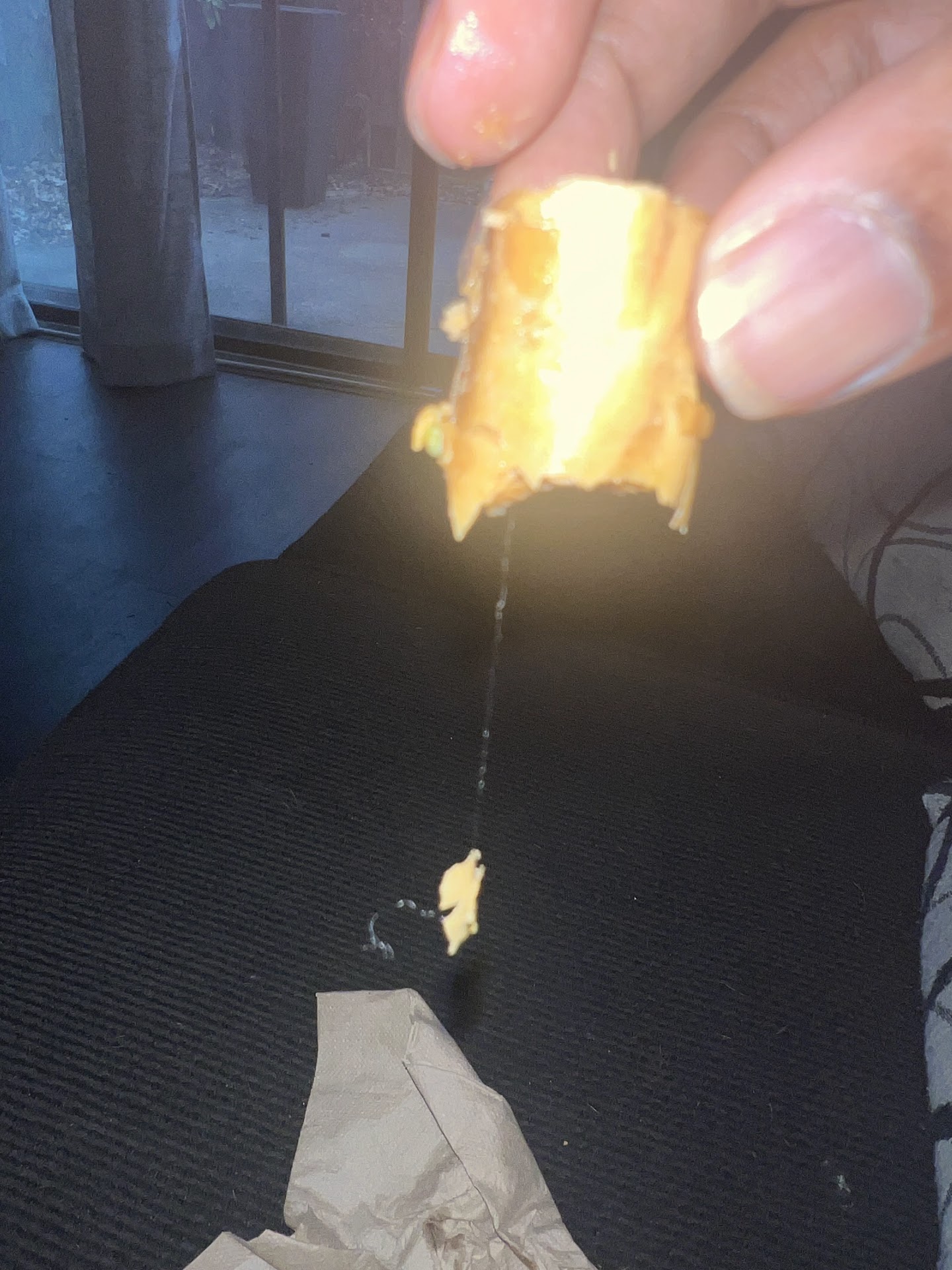 Food: Take-out, I ordered the lamb Sittoo’s Lamb Sandwich and the small baklava (which included two fingers and one small piece I believe it is called diamond) totaling three small portion sizes. I requested to have my sandwich made spicy. It was really good. The lamb was tender and easy to eat, and the pita tasted fresh and soft. I ate this in the car (the reason why I do not have a picture of it) due to being on a time constraint to get back on the road. I did not eat any of the baklava until I got home. When I opened it I gave one of the fingers to my boyfriend so he could taste it and I ate a little of the “diamond” piece. I then decided to eat the other finger. I took a bite and when I went to take another bite I is when I saw the hair hanging from the finger. I tried to give a good picture so you can see it is not on the surface but actually inside the finger. Needless to say I did not eat anymore of any of it.