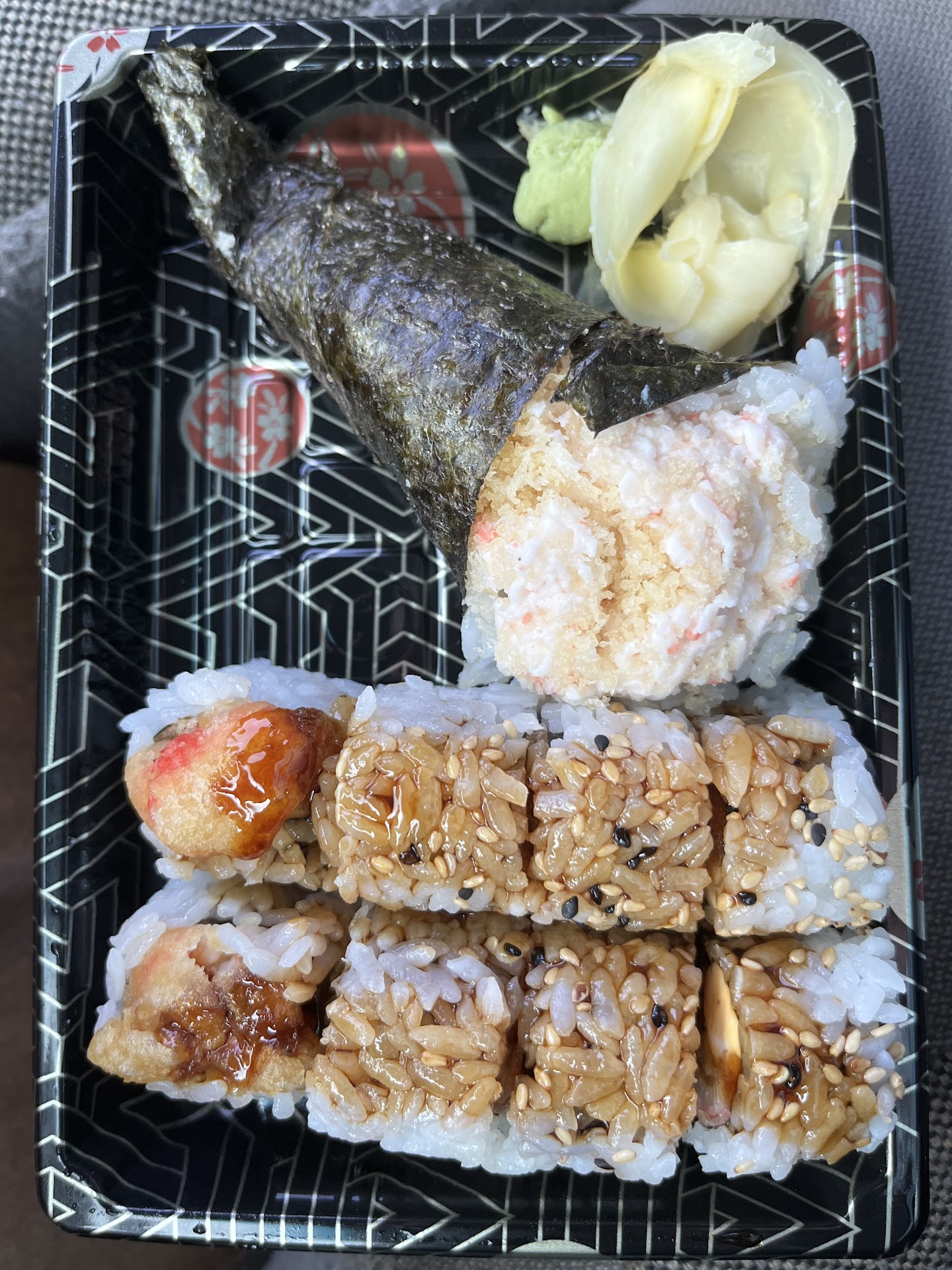 Once I went to go pick up my order and opened it I noticed my rolls were so small! Yes they are hand rolls but I thought they’d be a bit bigger like other places I’ve went to and they’d make them larger. First picture is of Takara Sushi, These were about a half bite size (like very small, the plate they are on is tiny) compared to like what I’d usually get at Shogun Humble TX (plate is about two of the to go plate in first picture but look how stuffed those crab rolls are!!).