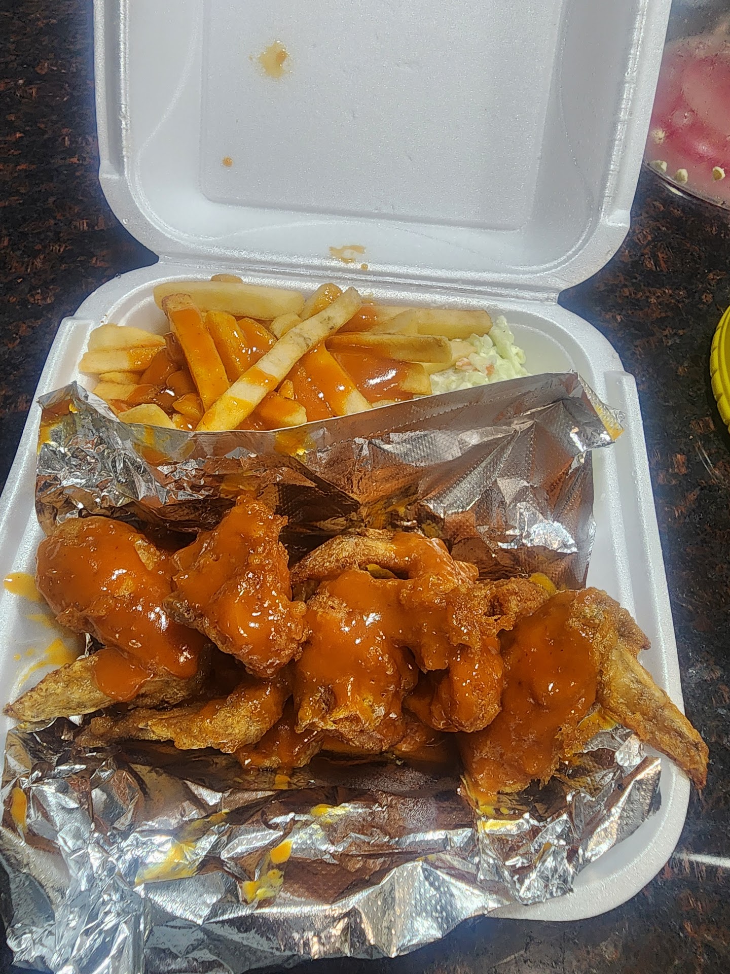 I ordered 2 WING dinners, one with greens and yams and the other with yams and Mac & cheese. Well they didn’t have any yams, and they only had one serving of greens (which was pretty much another serving of meat). So I ended up with 2 chicken dinners , one with fries and Mac and the other with green and Mac.