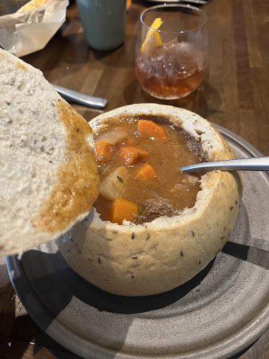 Food was great all around. The pretzel app was a big hit right away… warm, soft, salty, all the good stuff. The pork roulade was crazy tender. The beef stew in the bread bowl was awesome too… super hearty and full of flavor. The salmon was decent but the cream sauce kind of took over the dish (our only dish that wasn’t a Homerun, but the fish itself was still great.) The pizza was also a big win.