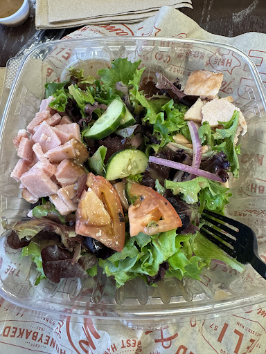 This is so good! Was looking for something different to eat. Saw Honey Baked Ham on Google maps and thought, “Why not?!?” I do love their ham at Thanksgiving. So I went in. They have a decent menu. The Cobb salad is delicious. Most places you get plastic tasting lettuce. Here you get baby greens that are so fresh. I was shocked. You get the same delicious honey baked ham in the salad as a ham roast at Thanksgiving. Not the very unhealthy lunchmeat you get at other places. The bacon crumbles are actually real bacon that is so crunchy and superb. I also tried the chef salad pictured below. I ate some of it before remembering to take the pic! Oops! I got mine without cheese and croutons. There was no line and no waiting. Samantha, the cashier, remembered me from two previous visits and knew my order! She was also very sweet, not bored and annoyed that she is working. She was very helpful and tried to assist me in making my order decisions. She made suggestions and gave descriptions. In 5 visits she hasn’t been having a bad day yet! So, all in all it was a great experience! Great food and wonderful service!