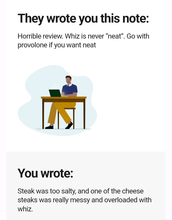 Read moreI've passed by this place plenty of times, wanting to go in and check it out since I love cheesesteaks. Ended up ordering thru doordash, and I will never give this place my business again. Maybe don't have a place of business if you can't receive negative feedback in a professional manner. I know cheesesteaks. I've had plenty in Philly. Steak was too salty, and based on other reviews on Doordash, I'm not the only one who thought so. I've had cheesesteaks with whiz before and it was not overloaded and a huge mess like the one I received. My husband also thought the sub wasn't that good. Responding to a review with an attitude is bad for business. Glad I never actually went in person. Whoever responded to my review said, "horrible review." Well, feeling is mutual.. a horrible sub warrants a "horrible review." This place is nothing "original" like the subs from Philly. Oh, and the fries were horrible, too, since...