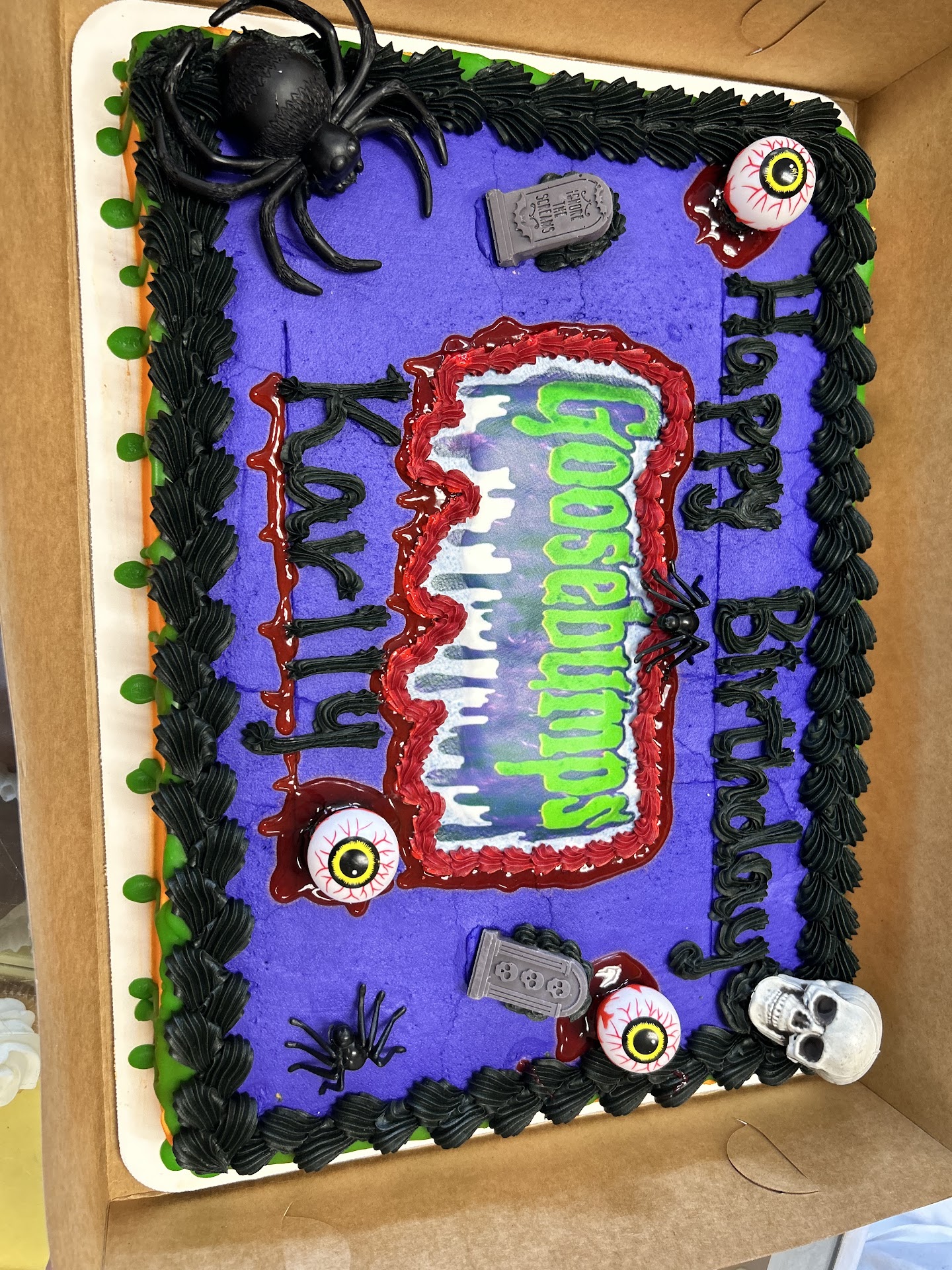 My little girl loves everything spooky. So for her birthday she asked for a goosebumps themed cake. I called all of the bake shops around, and this was the only bake shop that didn’t treat me like I was a complete weirdo since it was May. I told the cake decorator that my only stipulations were that it needed to have the goosebumps logo and the iconic green purple and orange colors somewhere on it, other than that I wanted her to let her inner spooky girl run wild! She asked me what size and I also let her choose what would best help make this cake great, and when I came to get it this bake shop did not disappoint! My little girl was beyond thrilled with her...