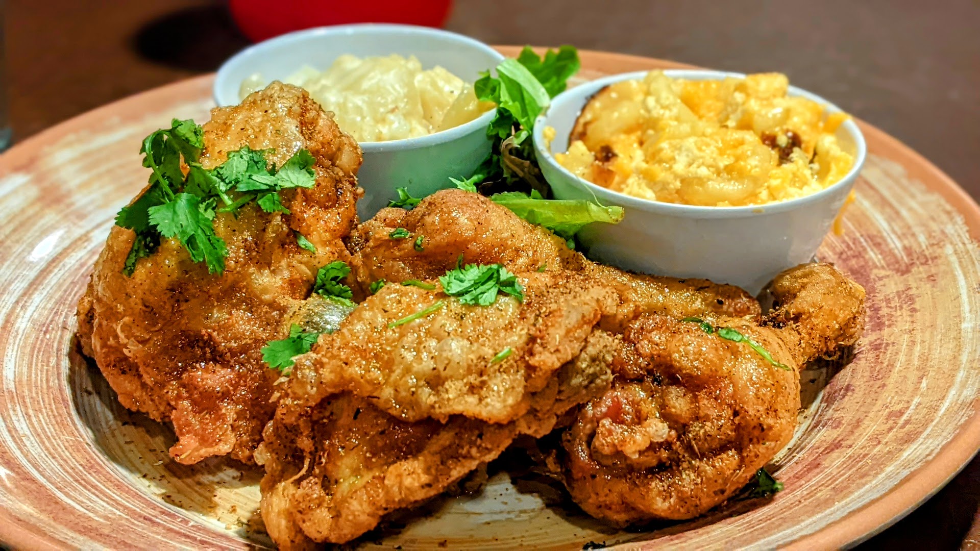 My wife had the Honey Chicken w/ Scalloped Potatoes and Baked Mac and Cheese. The chicken was delicious, tender on the inside crunchy on the outside. The only thing is that she wished the chicken was seasoned more on the inside. But she just dipped the chicken into the honey glaze sauce. The scalloped potatoes and baked mac and cheese were delicious. Oven baked is the way to go.