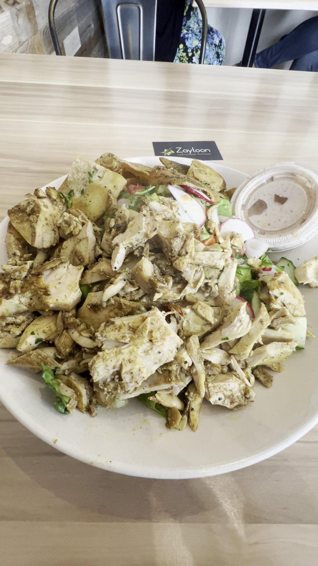 I ordered the Large Fatoosh Salad w/Chicken Shawarma (also offer smaller size). My order was ready in no time and the generous portion of chicken was steaming hot (see the video) atop a huge bed of fresh salad greens and delicious seasoned pita chips that were perfectly paired.