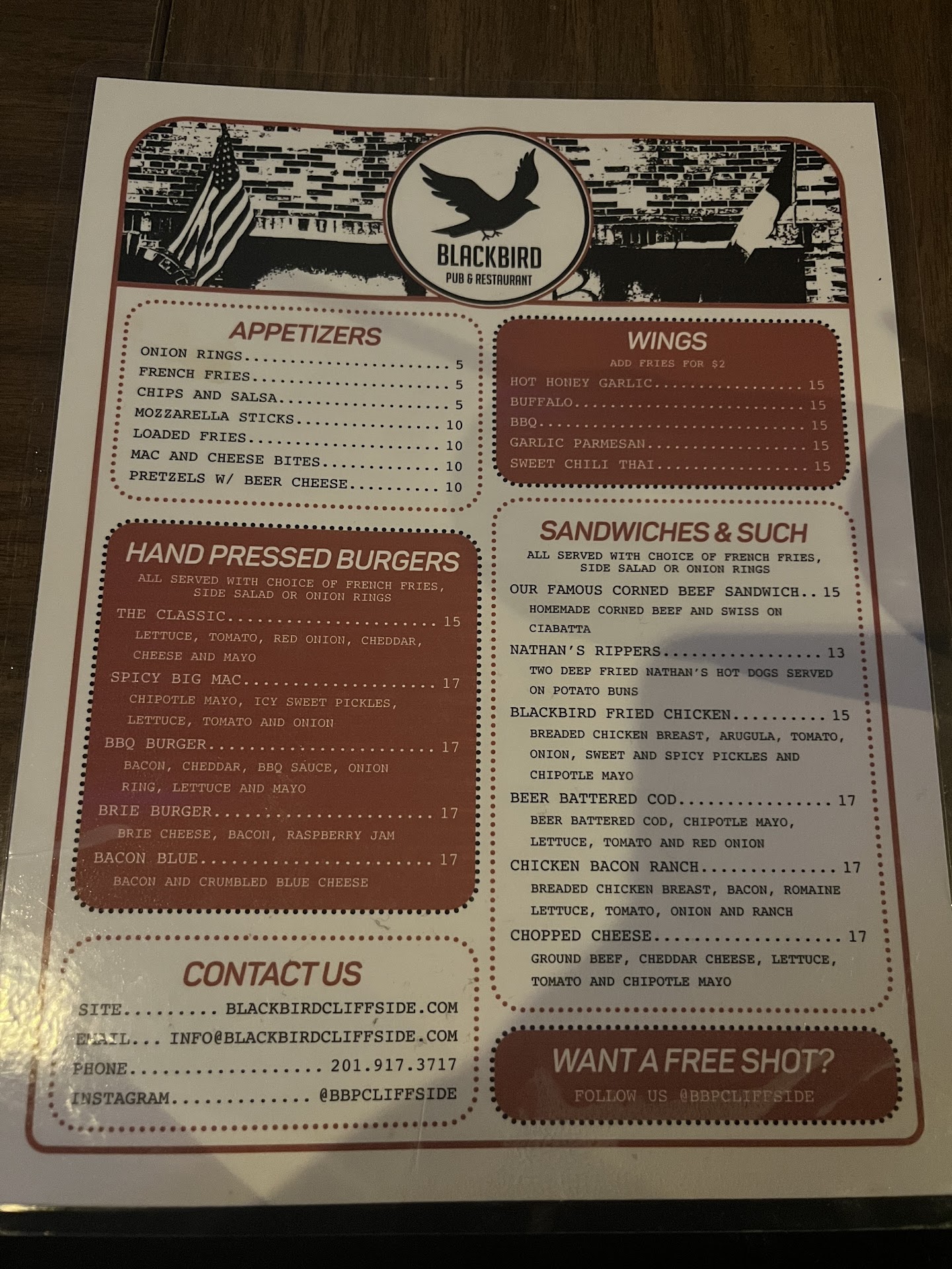 I am not really big on writing reviews (since the reader can never be sure if they are ārealā), but I have to make an exception with the Blackbird Pub and restaurant, in Cliffside Park New Jersey. The moment you walk in the door, you are greeted and made to feel welcome, as if you are an old friend, not a āwalk-inā. That high level of attention continues throughout the visit. You literally never have to ask for a beverage re-fill, the staff cheerfully graciously stays one step ahead of you all the time. Regarding the food, The Blackbird offers a nice variety of appetizers, sandwiches, and they like. While I have not tried everything on the menu, I can definitely say that the various hamburger options are all superb, as are the wings, with five varieties of sauces, (hot honey, garlic, barbecue, buffalo, garlic, parmesan, and sweet chili Thai). Prices are reasonable; the crowd is always genial and mellow, and the owner and staff are warm, friendly, and frankly an interesting group of characters with entertaining stories to tell. I highly recommend that you give The Blackbird Pub and Restaurant a try. You will be glad...