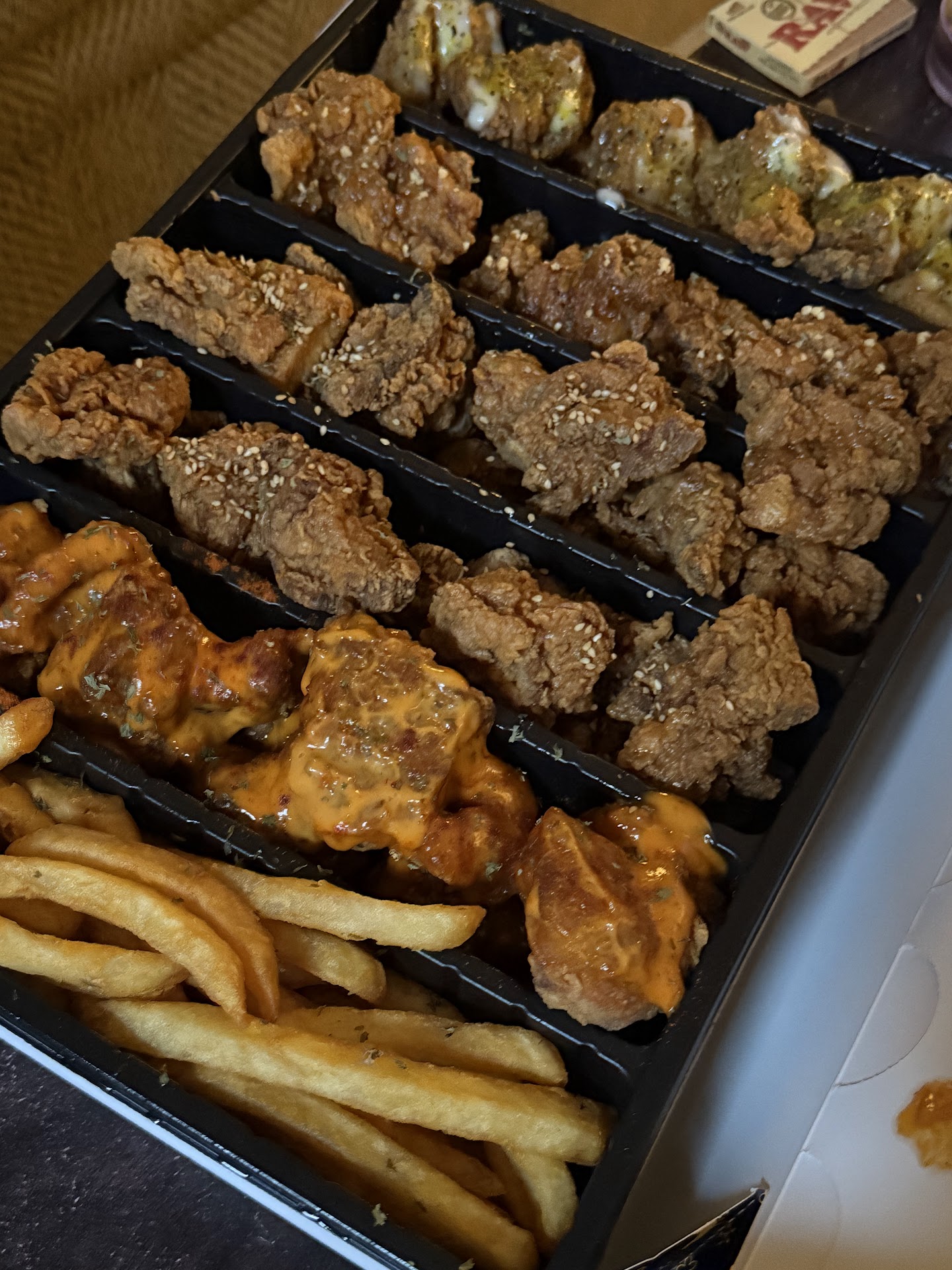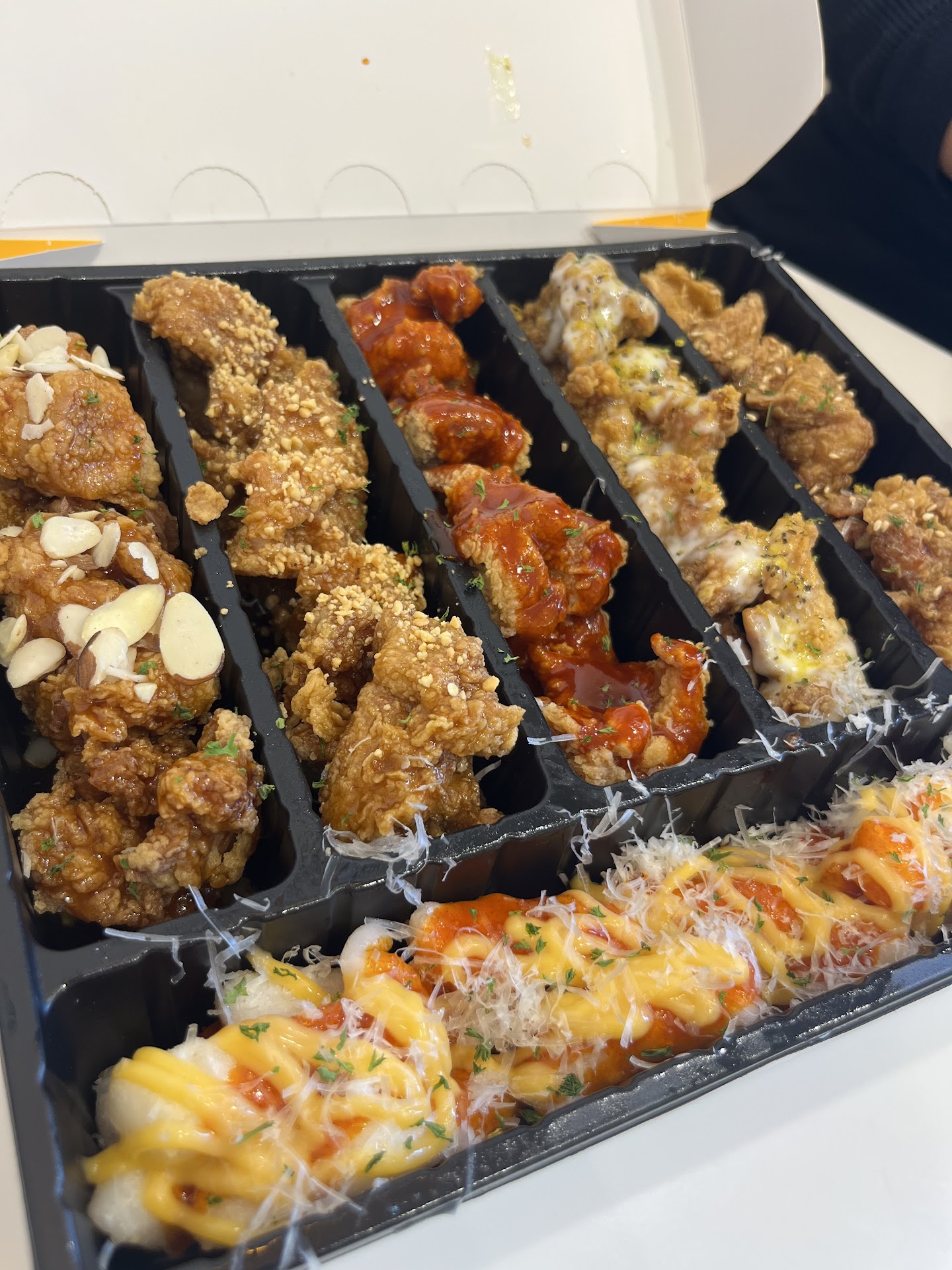 Price: while some people might see $30 for this meal as expensive I definitely did not think so. At all Korean fried chicken places you pay about $30 for a large box of of boneless chicken or for about 20 piece wings box, I’ve eaten at my fair share of Korean fried chicken places (like I said I am a large man) but this place definitely gave the most chicken for the price point, on top of that most places only give you the option of one or two sauces which can get old after a couple bites but this places offers a large quantity of food with a variety of flavors so you can try all of them and so the meal does not get boring.