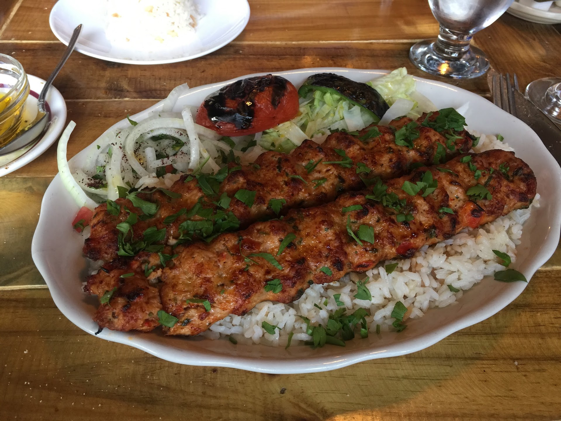 My partner and I ordered a small Shepherd Salad (a mix of finely chopped red tomatoes, cucumbers, green peppers, onions and parsley, seasoned with herbs and tossed with olive oil and vinegar), which was more than plenty for two; Hummus, Tavuk Adana Kebab (skewered ground chicken mixed with bell peppers, garlic and spices) and Fistikli Kebab (skewered ground lamb and beef mix with pistachios and herbs). They were two of the best kebabs we've ever had.