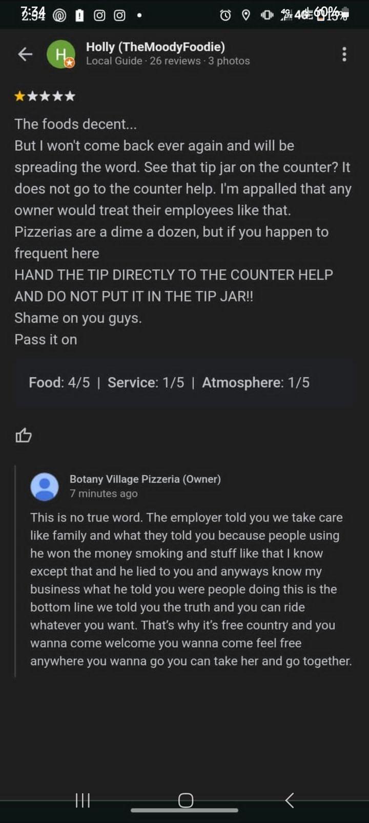 Read moreThe foods decent... But I won't come back ever again and will be spreading the word. See that tip jar on the counter? It does not go to the counter help. I'm appalled that any owner would treat their employees like that. Pizzerias are a dime a dozen, but if you happen to frequent here HAND THE TIP DIRECTLY TO THE COUNTER HELP AND DO NOT PUT IT IN THE TIP JAR!! Shame on you guys. Pass it on