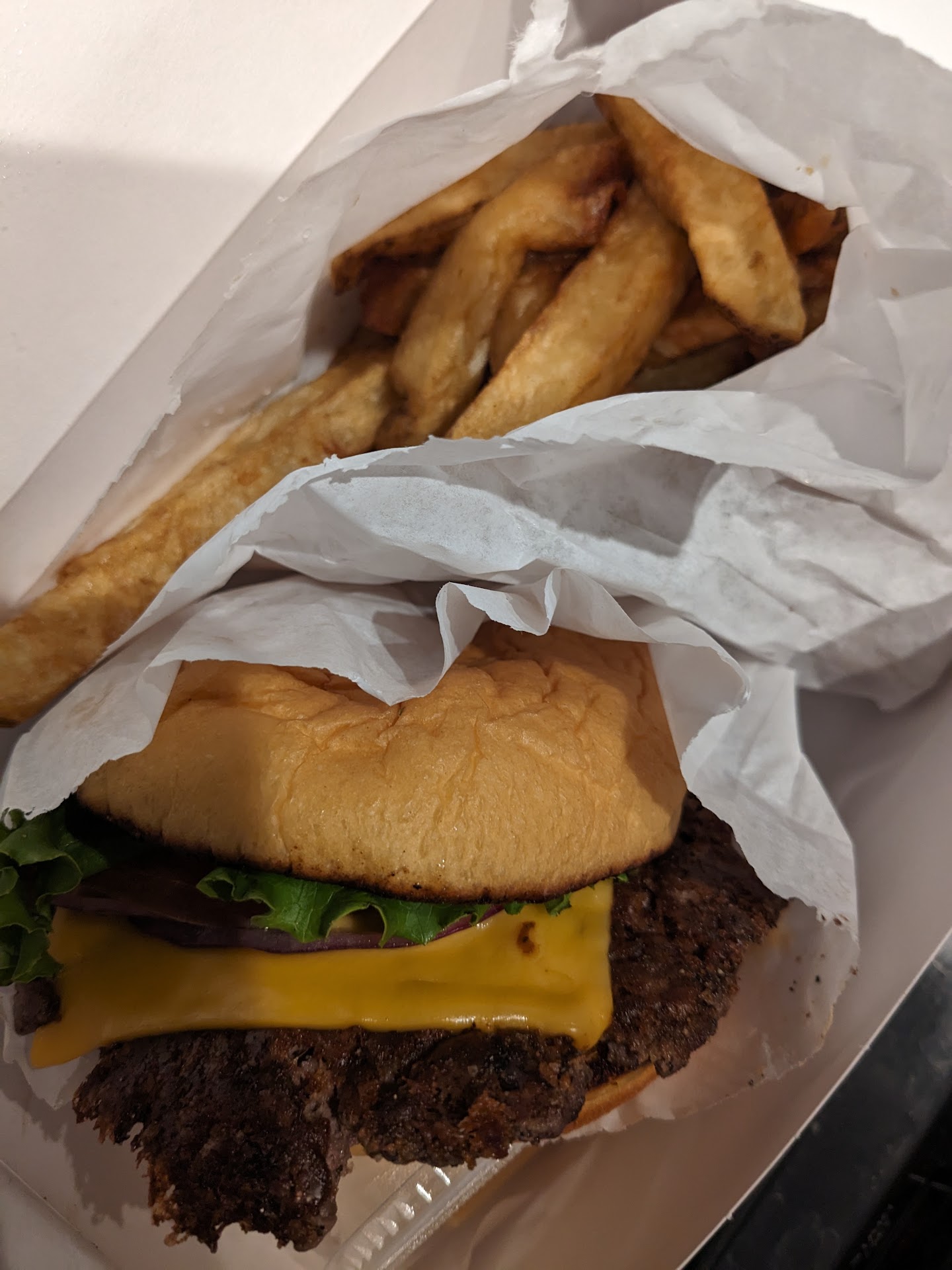 I drove home for a good 45 mins, so I'm not sure if that affected the burger itself. But at first bite, it was nothing special. Not outstandingly juicy or flavorful. What I disliked the most was the burned buns. Overly toasted, so it added a very bitter taste. The fries were so greasy and lacked crunch. Just too soggy. (But again my drive was a bit long). Probably old frying grease too. Can't put my finger on it.