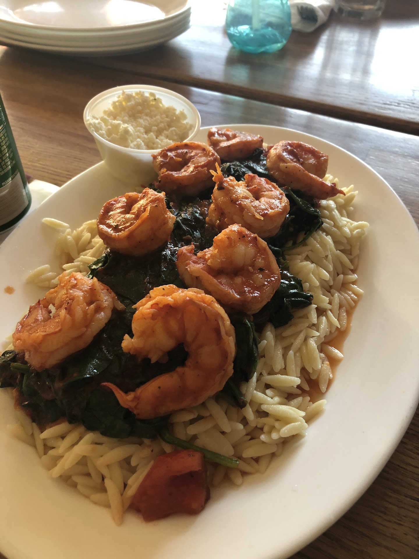 First is the shrimp with spinach over orzo. This dish needs to come with a choice of rice. It was about 24 dollars. It should come with at least 10 shrimps at that price for that size. The spinach and shrimp were cooked well. The chef did a gold job. We had the feta on the side and the feta they have was fresh and good.