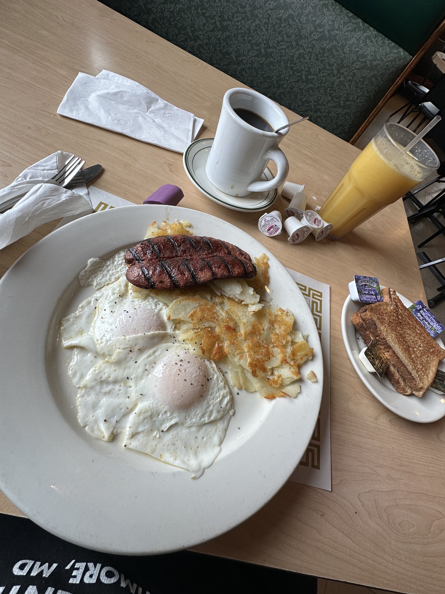 Read moreI've been craving Pancakes for almost 2 weeks. This Sunday we decided to go out and visit a Diner. I haven't visited this location in over a year post Pandemic. We parked, walked up and thank God no waiting. The Diner was very busy and under staffed. Considering the obvious, we had a very pleasant breakfast. My Pancakes weren't steaming hot, more like a little over the warm state the butter still melted over them a little slow, but good enough. Scrambled eggs and sausages were fine. Everything was tasty. My spouse had an omelette with home fries and toast. No complaints there. Our waitress Val, or Valerie did a good job at keeping her composure under the stressed conditions. Every single staff member(s) were busy multitasking. They seem to work well together and everything was under control. I've been visiting this location for several yrs and we have always had a pleasant time. Hope this helps. I did take a pic of our oders but our plates were empty and i didn't feel it would have been appropriate. The pic does speak for the food lol stay...