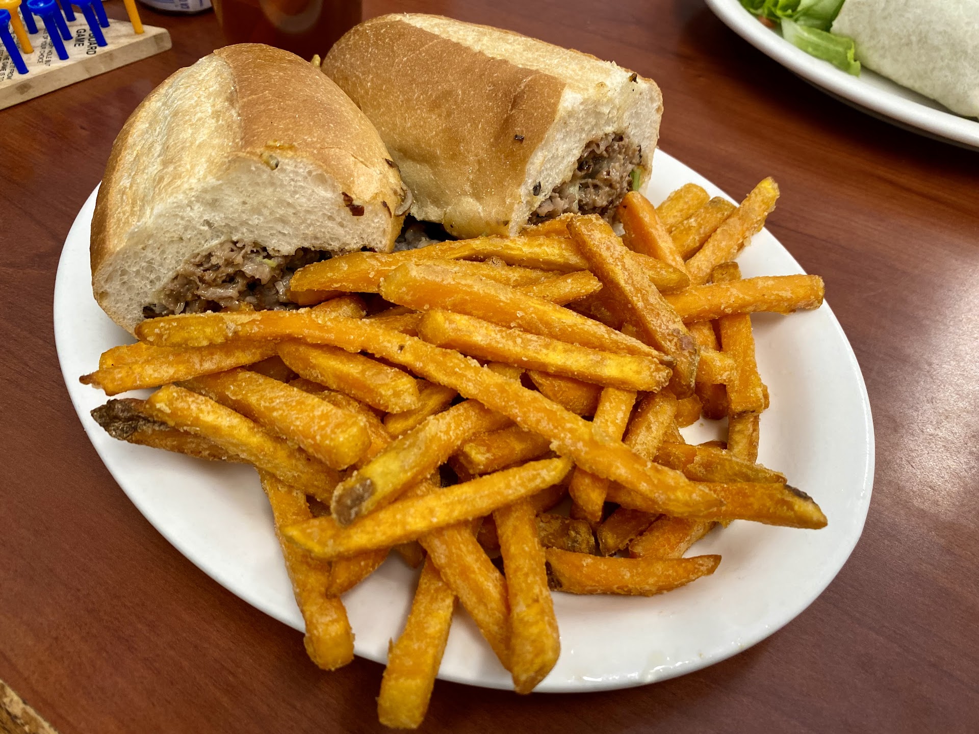 Their menu serves breakfast, brunch, and lunch with vegetarian, keto-friendly, and gluten-free choices available upon request. We decided on the cheesesteak with a side of sweet potato fries and the chicken pesto wrap with a small garden salad.
