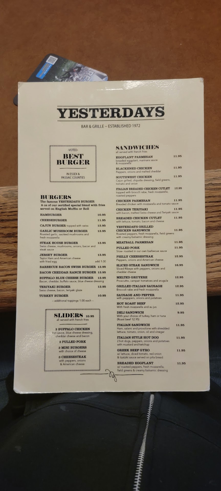 The food was GREAT! I had their special which was a 12oz pork chop in a garlic sauce with Spanish style cut potatoes and yellow rice. I will be talking about this dish for years! Others in our group had various burgers that they raved about. One person in our party had the breaded chicken cutlets with broccoli rabe, roasted red peppers and fresh mozzarella. She loved it. We live out of state now but as long as Yesterday's is open , we'll have our reunion dinners here...