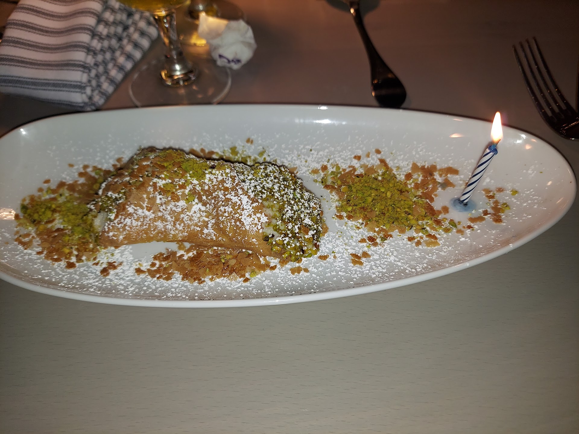 We ordered a couple cocktails🍸, they were delicious. As for the food, 5 🌟! We started with the classic calamari which was lightly fried and served with lemon and a marinara sauce. We also had the artichoke appetizer which you guys is a must try! Classicly served as a whole half charred artichoke with a feta, tomato, pinenut, olive oil mix on top of it. It was so delicious and I loved eating the artichoke pieces whole. I would come back for this appetizer alone. We ordered the stuffed shrimp, gnocchi pasta with a side Italian sausage, chicken parmesan and white spinach bacon pasta (not real name but it was a white cream sauce). Everyone throughly enjoyed their entree which came with a choice of soup or side salad. My father enjoys seafood over cooked/well cooked he did ask the server to have the chefs refire it to cook it more, they actually remade the whole entree for him and the server had comped his meal from the bill. Our servers name was Kevin, this man was a phenomenal server. He asked us if we needed anything at least 15 times, stayed on top of refills, was very kind. They ended up bringing my fathers dish but we took it home. My father mentioned we were there in celebration of my birthday to which Kevin asked me to choose a dessert from the menu and they ended up surprising me with a big cannoli which he mentioned was also comped.