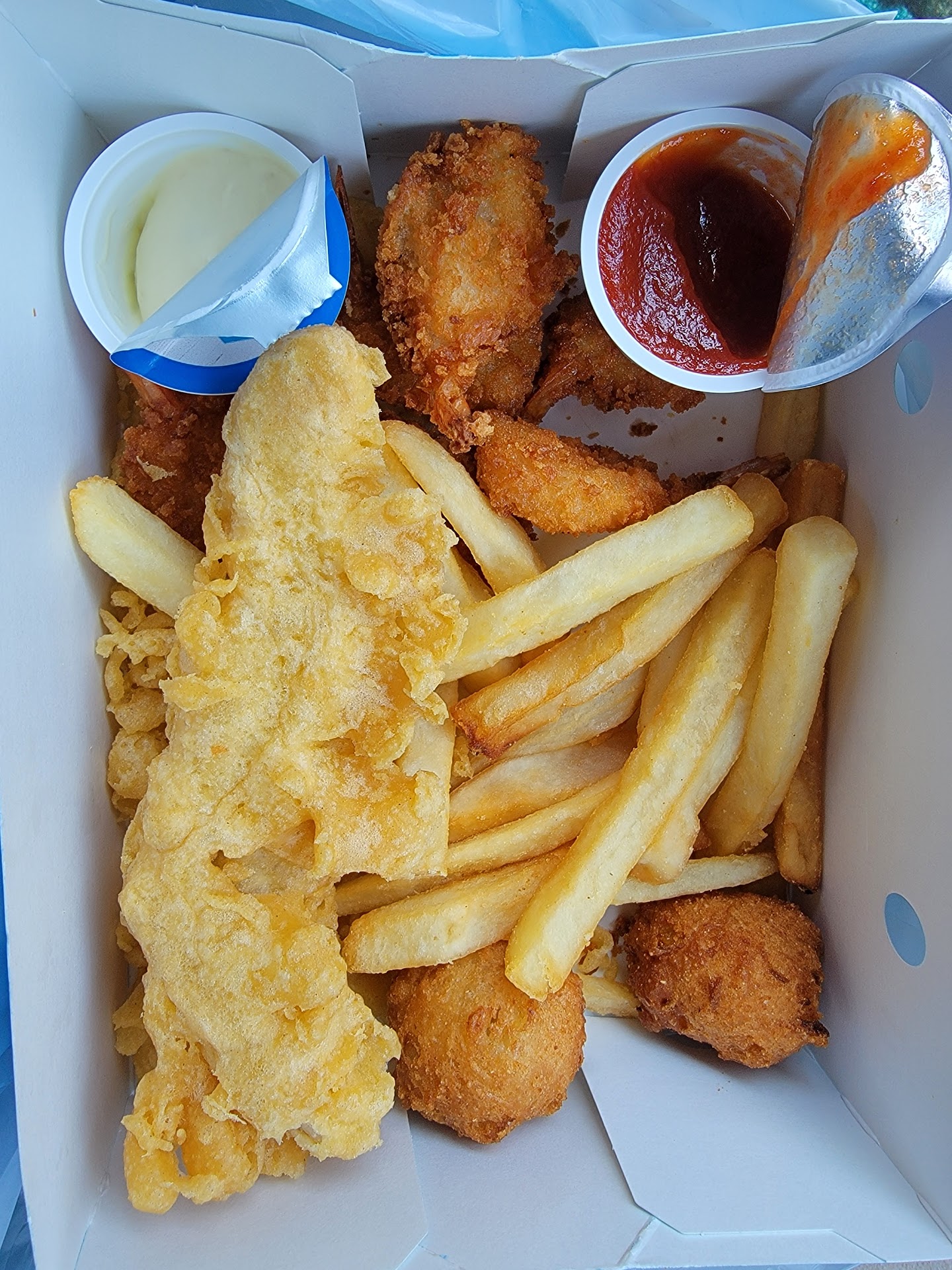 I had the pleasure of coming here to receive fantastic service and incredible food! I ate the Deluxe Seafood Platter, the Jalapeño Poppers, and the Grilled Shrimp. I was so excited to dig in, I forgot to take pictures! The Platter came with tasty green beans, creamy and cheesy mac & cheese, 2 pieces of batter dipped fish, 2 seafood stuffed crab shells, 6 butterfly shrimp, 2 hush puppies, and below all the fried seafood, there was a thick layer of fried batter pieces. Not only was all the food delicious with and without sauce, but you NEED to get mac & cheese with this meal! Add all those fried bits to it with some hot sauce if you want, and that is an incredibly delicious bite of food. The side items I got were equally tasty and I would definitely recommend the Poppers to anybody who wants some fried cheese with a kick. The food was not the only amazing part! Every employee I spoke to was extremely kind and generous. They seemed happy to be there and were very excited about their food and how good everything is. This is a fast food seafood restaurant that must be added to your go-to list if you're...