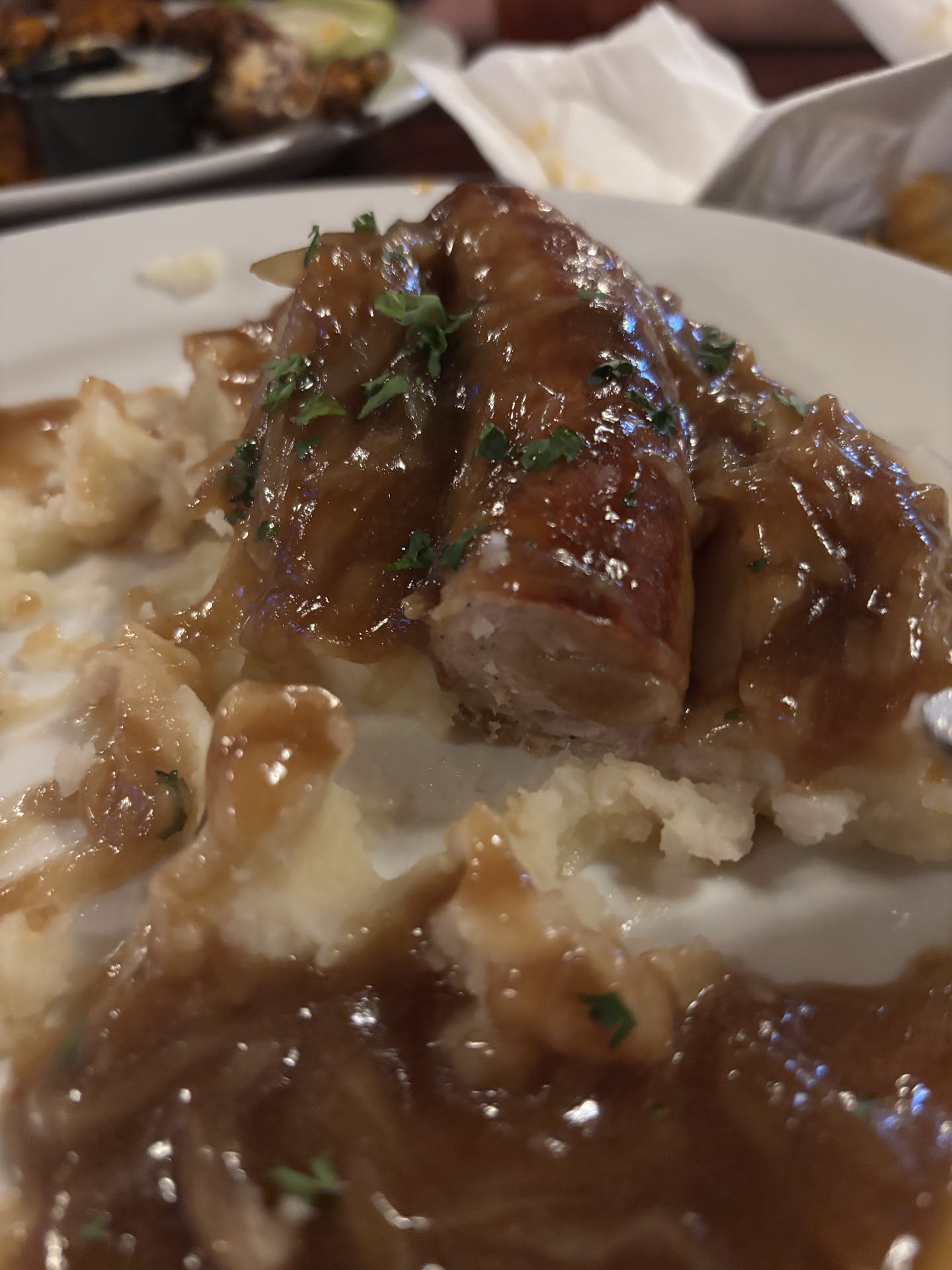 The breaded pork chop was burned and artfully concealed with the sauce it was served with. We were at the restaurant for an hour and 10 minutes, most of that time waiting to eat. A couple next to us came in after we gave our drink orders. They ordered drinks and a pizza, were served their meal and FINISHED it as my soup was being brought to the table. Okay, server tries to explain how the pizza line was not busy and the dinner line was, blah, blah, blah. A bowl of soup is ladled into a bowl. What's so time consuming? 15 minutes between soup and meal. The shepard's pie is a staple on their menu. They should be able to make it with their eyes closed. In this instance I think they did make it with their eyes closed.