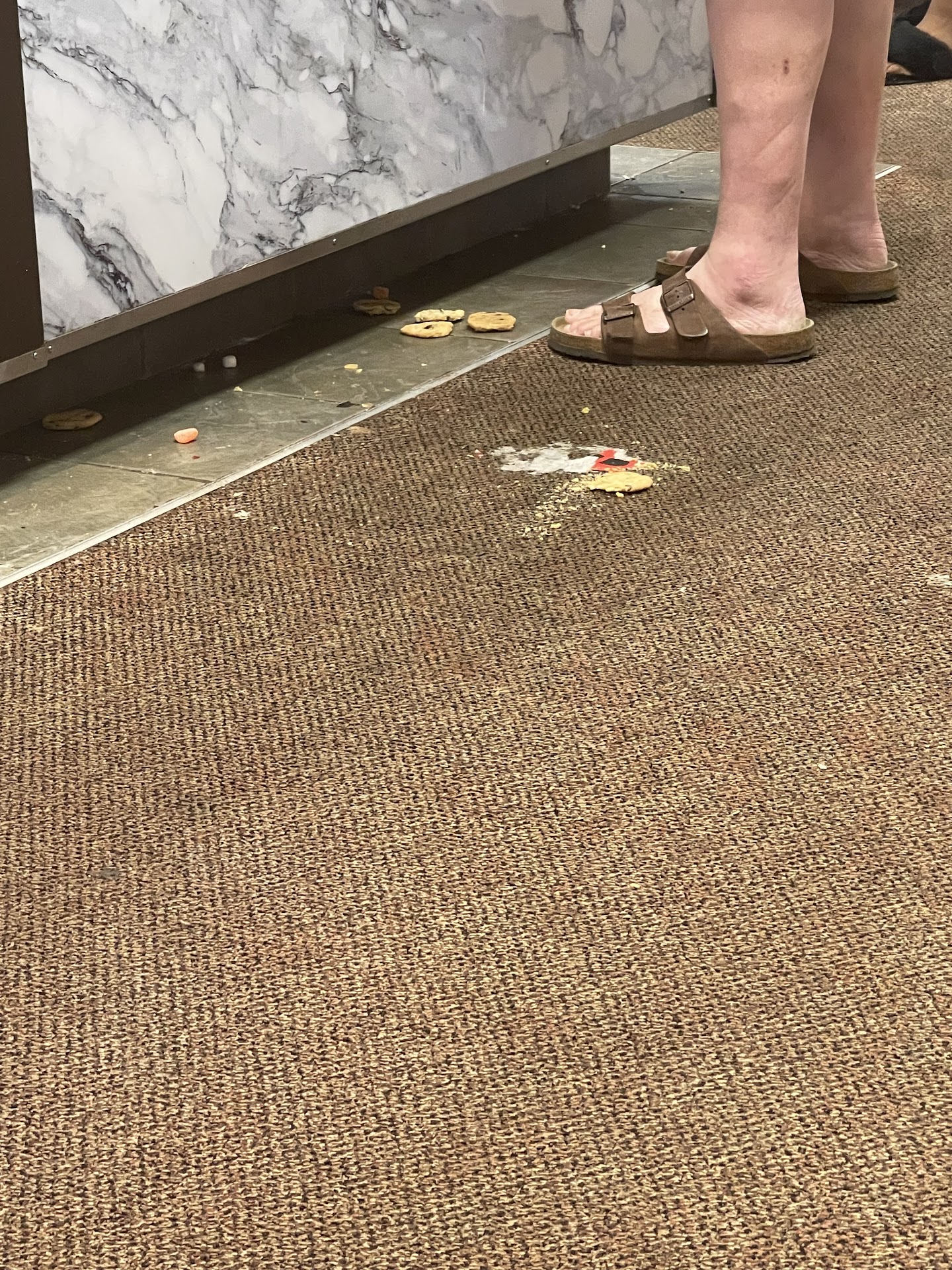 At the desert bar, there was chicken on the floor, food everywhere. My biggest concern was the fact that there were peanuts all over the bar, mixed into other toppings, on the cookies, on the brownies, etc. As someone with an extreme nut allergy, this type of cross contamination is deadly, let alone disgusting.