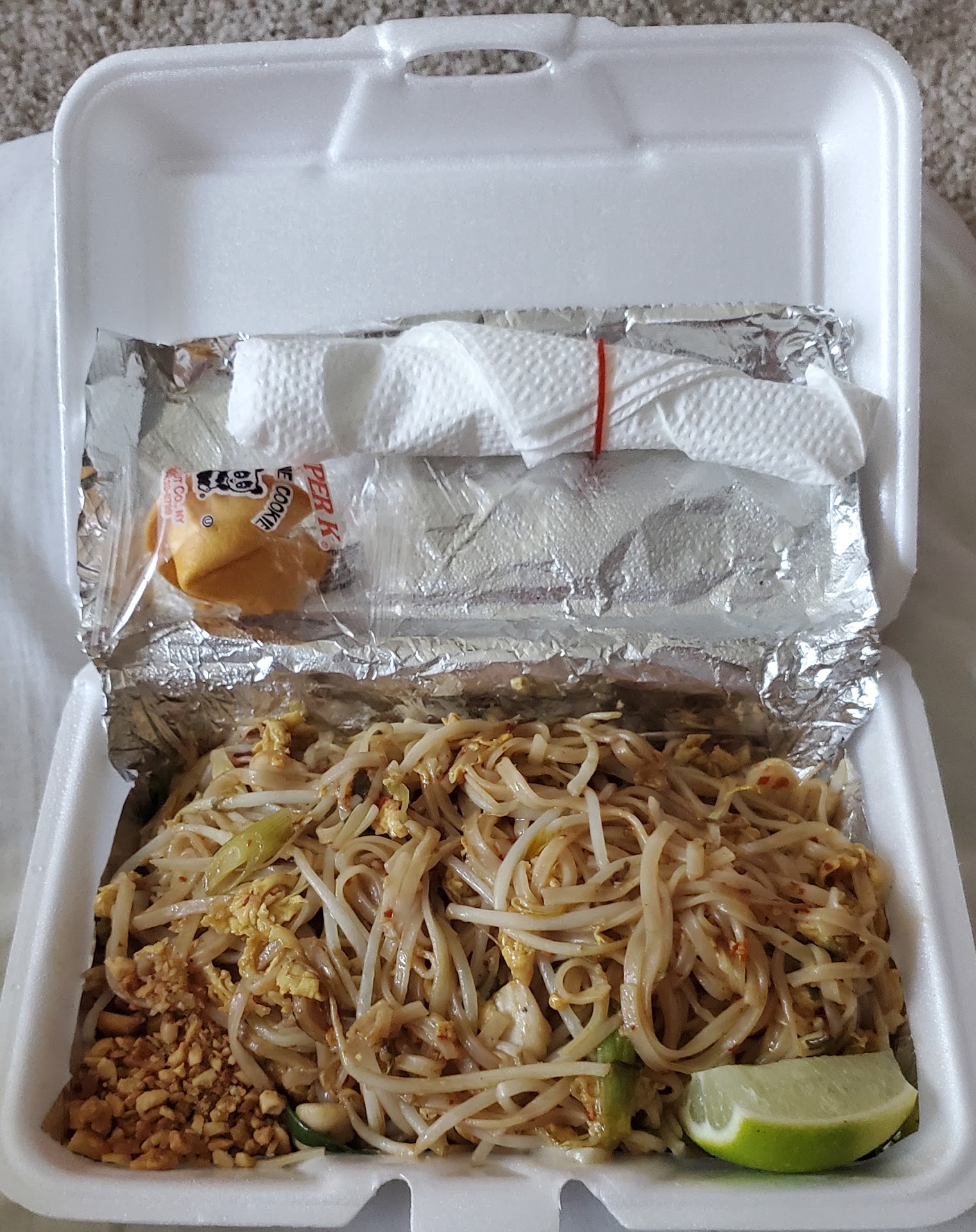 Time to try a place near home. After all, how will I find the go-to places to hit if I never stop anywhere in those last couple of miles? I've been hankering for some Pad Thai for days (weeks?) and decided to do something about it today. Seems Golden Gate, like a number of other restaurants I've been to, is more about carry-out than dine-in (I'm still adjusting to that). Ordered my favorite, Pad Thai with scallops, hot. First time in, you go with what you know. 5 minutes later, I had a container full of tasty in my grubby mitts and was headed for the door. $14 with tax. The contents were exactly as expected, a large pile of noodles, et al. The scallops were small and might not have been actually scallops (do your research, people) but it was a delightful dish that, in the future, I'll get extra-hot, though. 🌶🌶🌶🌶🌶 The interior could definitely use some work. Looks more like a old German restaurant or a sandwich shop inside but you can't taste decor. The man who took my order was very pleasant and patient. He also prepared my food. I like that level of authenticity and dedication. His accent showed that he was unlikely to have been born here but he's working hard and making good food. 👍🏼 That's all I need. I'll be back because the menu is huge! And I like nearly everything on it. Next up: Pad Thai Curry...