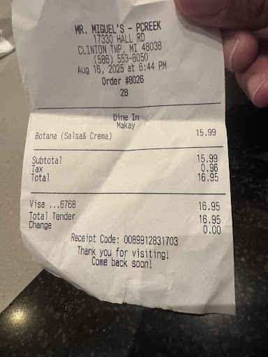 Read moreI was really looking forward to trying Mr. Miguel’s. Our party of four was seated quick which was surprising for a Friday night. The menu was a little overwhelming, I am a vegetarian and ordered the combo with cheese and bean to try a variety. The other couple in our party food came out then our waiter said the cook couldn’t make a bean taco. What?? The waiter didn’t understand why it couldn’t be made either.My husband and I had to wait for our food came out while the other guests in our party ate so their food didn’t get cold. I have worked in the restaurant field for many years and didn’t want to make a too much of fuss. I was able to order a bean chimichanga. Super weird because that is fried too but ok. I had a couple bites and it was super bland. I believe Taco Bell would have been better. When paying $20 a meal I would expect a little bit better. Margarita was just ok. Chips and salsa were good. Guacamole was ok but not fresh. Super disappointed will...