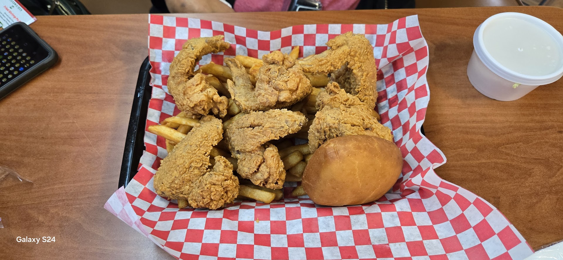 It was so good. Definitely going back. I had the chicken tenders, fries and hush puppies and my Ma had the chicken wings, coleslaw slaw and fries. The chicken tenders were tender, juicy and soo flavorful. The fries were so good I liked the style they had. And the hushpuppies had a kick that was so good I dug them alot. And the chicken wings were so fresh and flavorful very juicy and my ma said the coleslaw was wonderful she doesn't eat coleslaw all the time and very picky about it but she loved theirs. And the bread was sooo soft and the outside was like the perfect crisp for me. 10/10 would and...