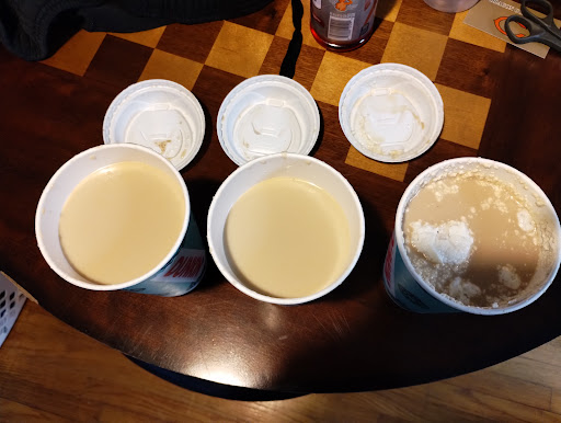 From the time that they took the medium drinks back and they gave us our large drinks, it had been about a minute and a half to 2 minutes. The cops weren't even hot or even warm, from the pictures that I am posting you can see liquid splashed all around the lids, and as you can see from the inside one of them looks like it has a whipped cream in it and the other two don't look the same. By the taste alone, it tasted like they had just poured the medium drinks into the large cups and added a filler like milk or something else just to finish giving us our drinks and get us out of there because the manager seem to really irritated and snippy at everybody.